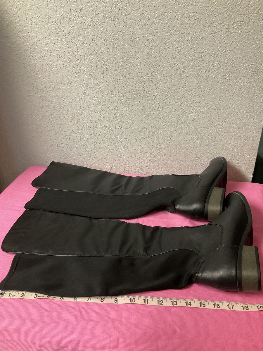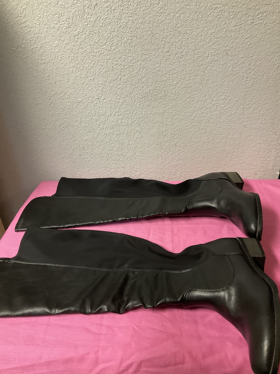 These boots are actually in Like NEW condition having only been worn inside the house for a few minutes just to get the feel for them. They come all the way up to the knees (which is something that I found out that I didn’t prefer.) They are a size 8 wide. Please see all pics as they are part of the description. They come from my smoke free pet free home. Sold AS IS.