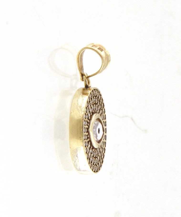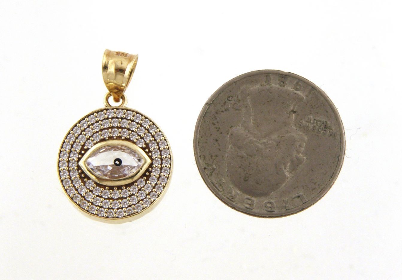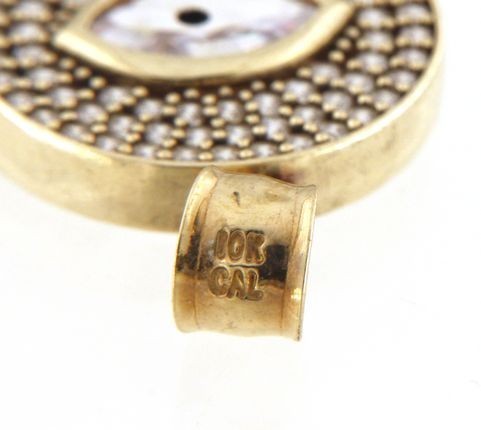 Type: CharmWeight: 2.4Karat: 10ktMetal: Yellow GoldGender: Women'sStyle: ReligiousSize / Length: 1"Owner applied: 10K CALStone 1 quantity: 35Stone 1 shape: RoundStone 1 color: ClearStone 1 weight (total): .35Stone 1 type: Cubic ZirconiaCondition:Used