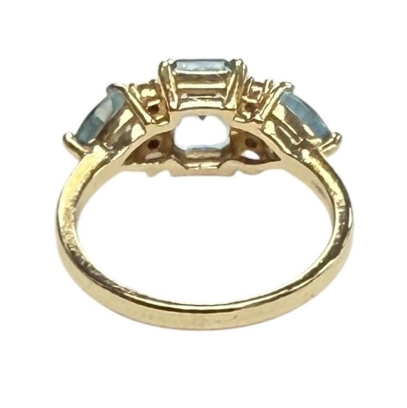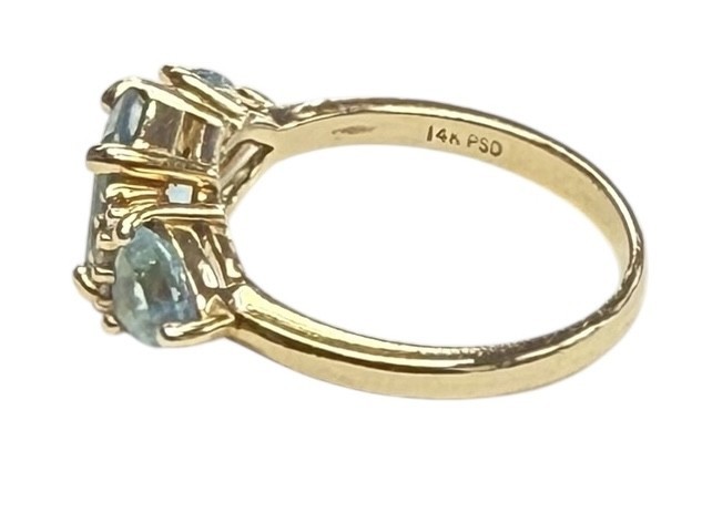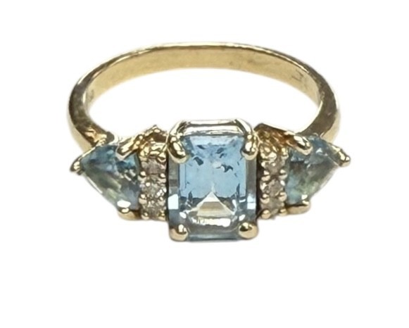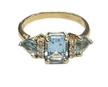Type: Cluster ringWeight: 2.3Karat: 14ktMetal: Yellow GoldGender: Women'sStyle: ClusterSize / Length: 7.5Owner applied: 14k PSOStone 1 quantity: 1Stone 1 shape: EmeraldStone 1 color: BlueStone 1 weight (total): 1Stone 2 Quantity: 2Stone 2 Shape: TrillionStone 2 Color: BlueStone 2 Weight (Total): .50Condition:Used