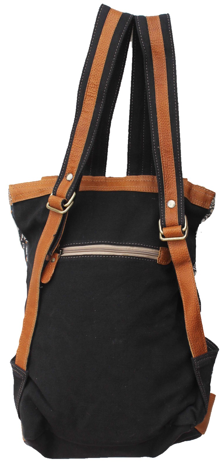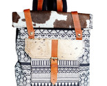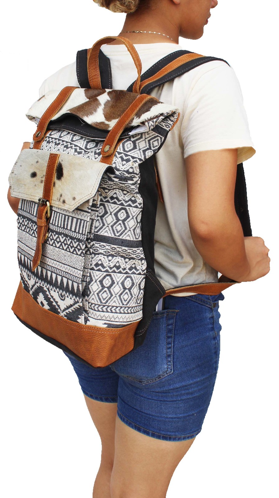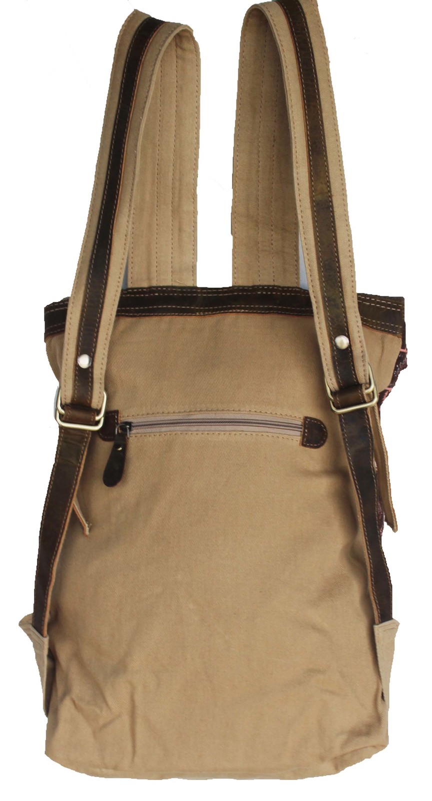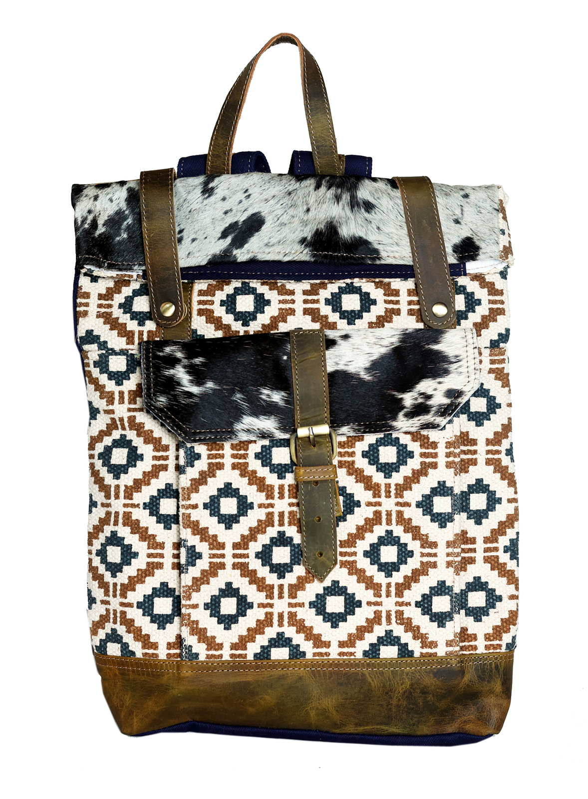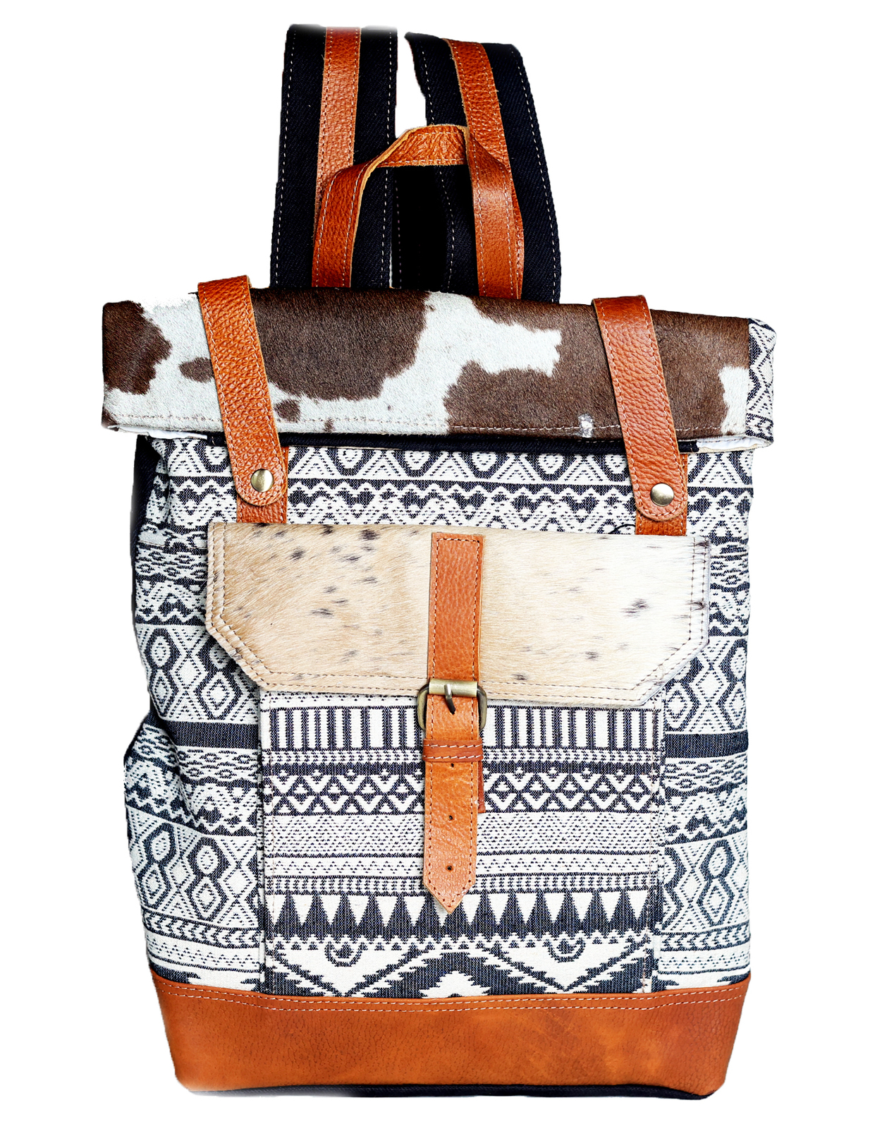 Challenger women's backpack made from upcycled canvas, cowhide, and distressed full-grain leather accents. Bag is uniquely accented with a beautiful western pattern. This practical, lightweight, and conveniently sized roomy bag is made sturdy to endure everyday use. Perfect choice for school, work, travel, or weekend trips. Main compartment has a button and full zipper closure that helps keep everything secure, while also offering a wide opening to easily access your belongings. The fully lined interior also features a side zippered pocket, and two open pockets for additional storage. On the outside you have one front pocket, and a zippered pocket on the backside. The antique finish brass hardware nicely ties the bag together. Bag measures 11.5" L x 16.5" H providing plenty of room for all of your everyday essentials.