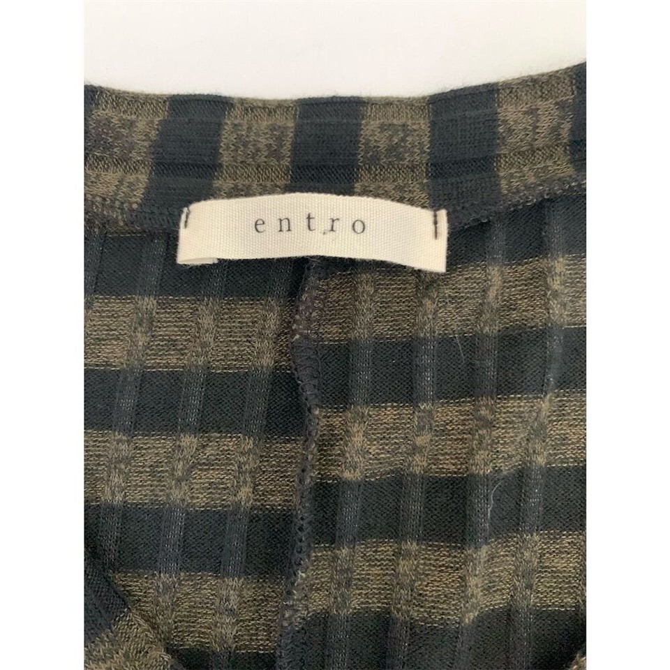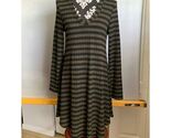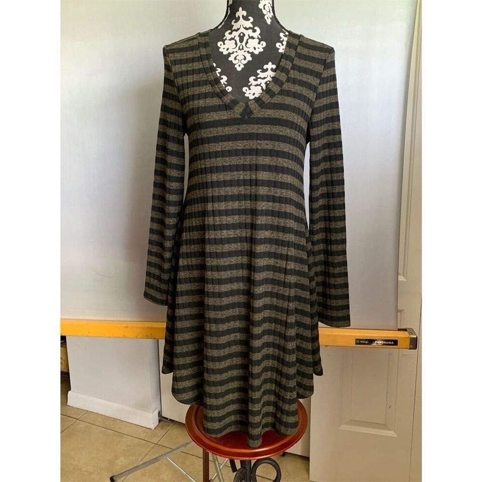 ENTRO women's sweater dress is a size large and features a swing style with a short length. It comes in a green color with a striped pattern, suitable for casual occasions. The dress is made from knit material, has long sleeves, and a V-neckline, making it ideal for fall. Manufactured in the USA, this dress is pre-owned.