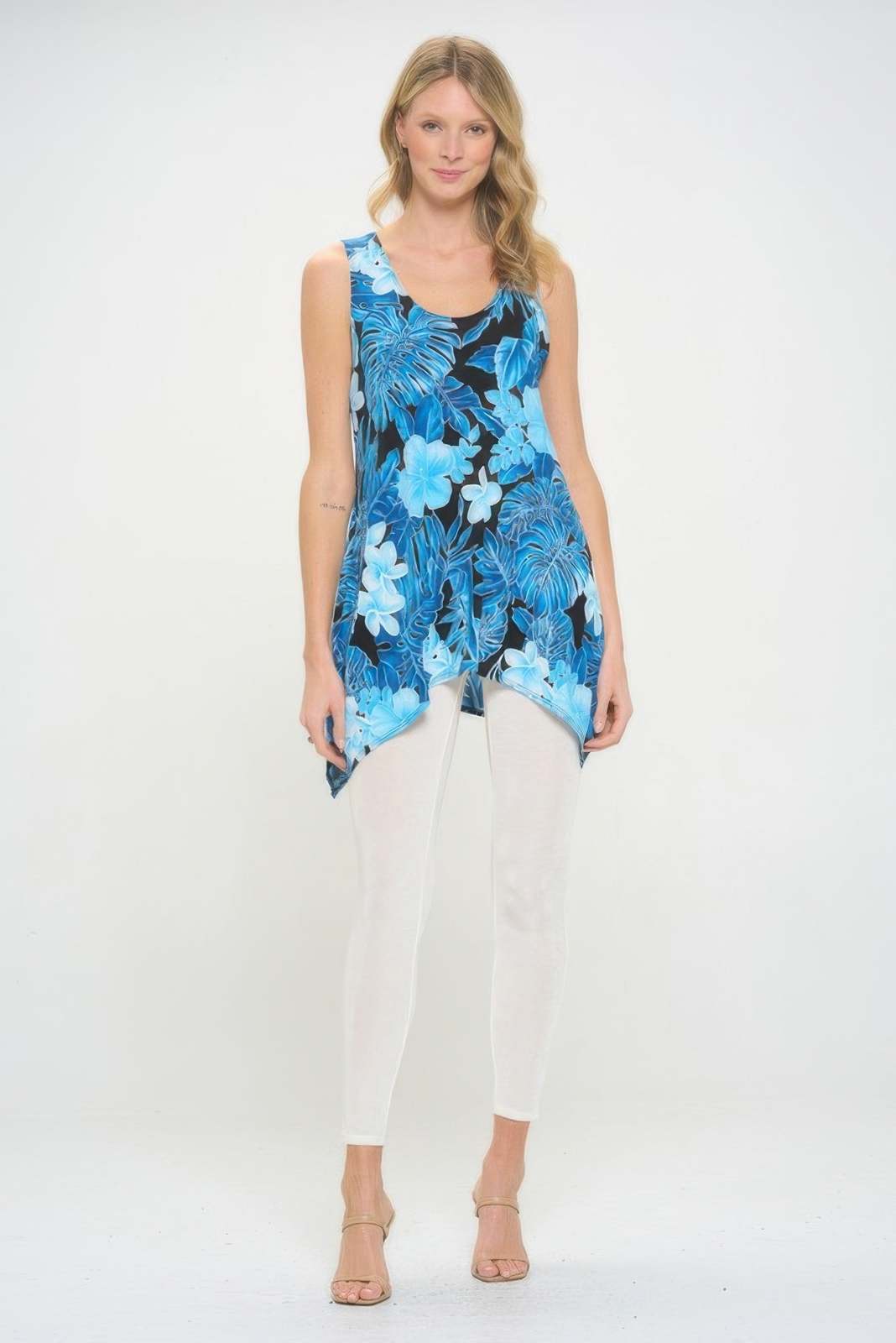 The HIT Print Shark Bite Hem Tank blends bold style with breezy comfort. Designed with a sleeveless silhouette and full back coverage, this tank is ideal for layering or wearing solo in warmer seasons. Its flowing handkerchief hemline adds flair to the look, while the allover print creates a standout finish. Lightweight and stretchable, it offers easy movement and an elegant drape. Proudly made in the USA, it's the perfect fusion of comfort and fashion.