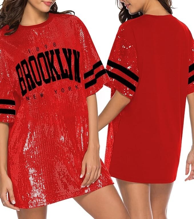 Women's Sparkly Sequin Short Sleeve T-Shirt Dress Casual Loose Cute Tunic Blouse size M Brooklyn Red
