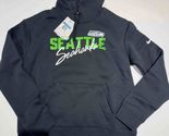 The product is a Women's Nike Heather Gray SEATTLE Fleece Pullover Hoodie in size small. It is an officially licensed sweatshirt featuring the Seattle Seahawks team logo and colors. The hoodie is perfect for football fans, specifically those who support the Seattle Seahawks, to wear during the regular season games. Made by Nike, a trusted brand in sports apparel, this hoodie combines style and comfort for female fans looking to show their team spirit.