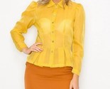 A woven blouse featuring organza material, a solid color, a button down front, long sleeves, a basic collar, and pleats.