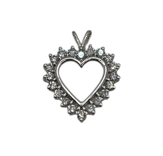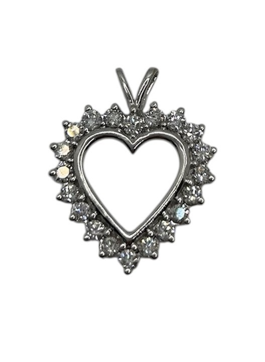 Type: PendantWeight: 1.9Karat: 14ktMetal: White GoldGender: Women'sStyle: HeartSize / Length: 1"Owner applied: NaStone 1 quantity: 19Stone 1 shape: RoundStone 1 color: ClearStone 1 weight (total): .75Stone 1 type: DiamondCondition:Used