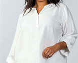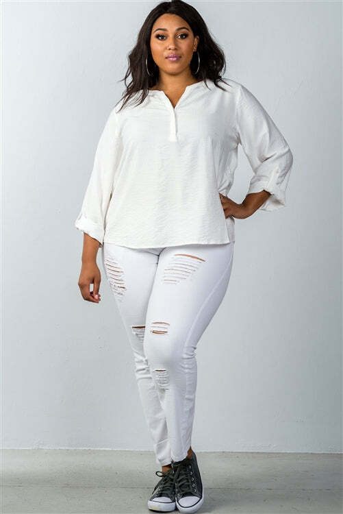 Plus Size Blouse features: long sleeves, roll tab sleeve, crew neck, hidden front button closure, relaxed fit, solid