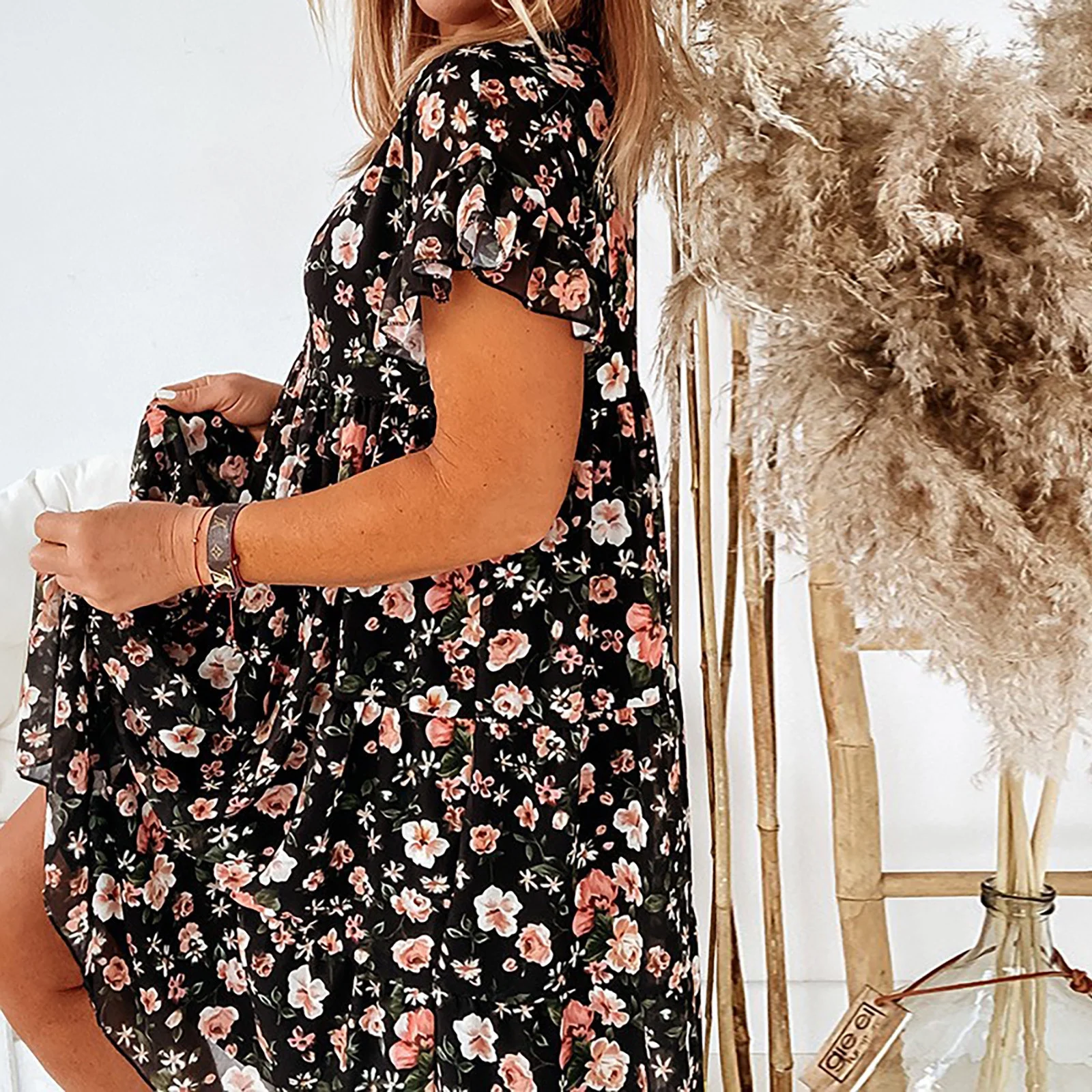 - Women's Plus Size Women's Summer O-neck Dress Beach Floral Print Ruffles Casual