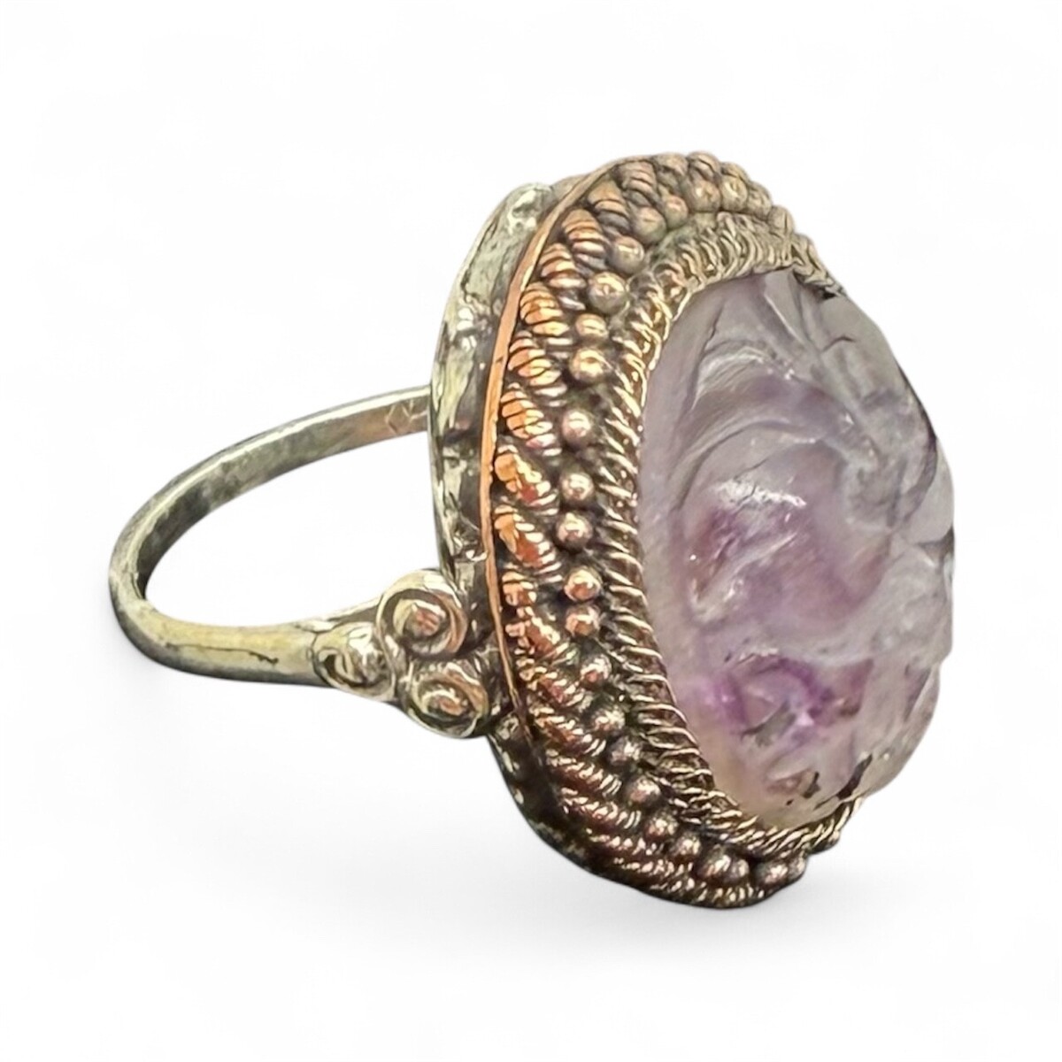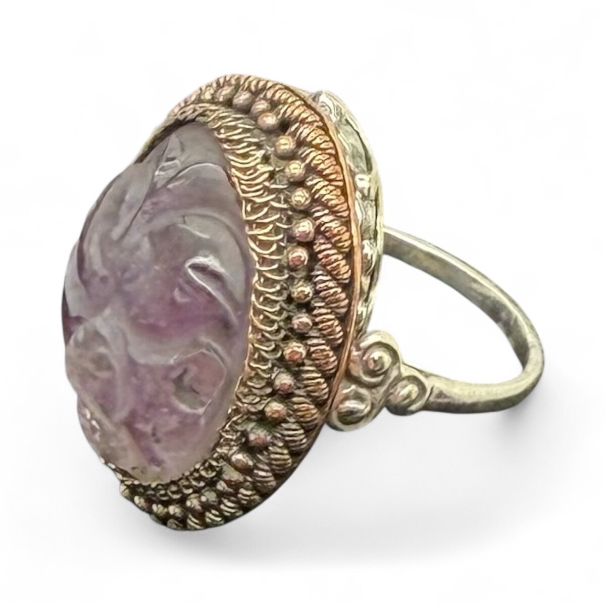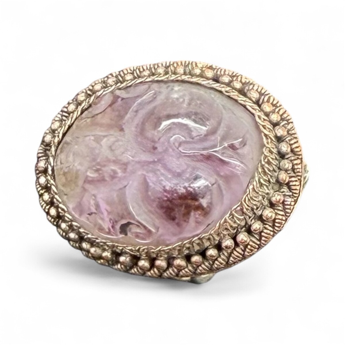 Type: Solitaire ringWeight: 4.9Karat: .925Metal: SilverGender: Women'sStyle: Art DecoSize / Length: 4.5Owner applied: (H)Stone 1 quantity: 1Stone 1 shape: OvalStone 1 color: PurpleCondition:Used