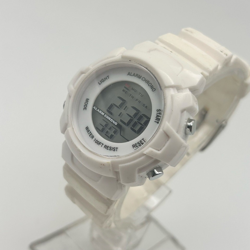 This women's white digital sports watch is in great working condition and ready to wear! It features a stainless steel case and a fresh, new battery. The watch case measures 35mm.