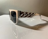 The product is a pair of women's designer sunglasses with a white and silver frame and black lenses. The sunglasses feature a shield style with a tinted lens technology, making them perfect for stylish and trendy accessorizing. The frame material is made of plastic, providing durability and comfort for everyday wear. These sunglasses are a fashionable and high-quality addition to any woman's wardrobe, adding a touch of sophistication to any outfit.
