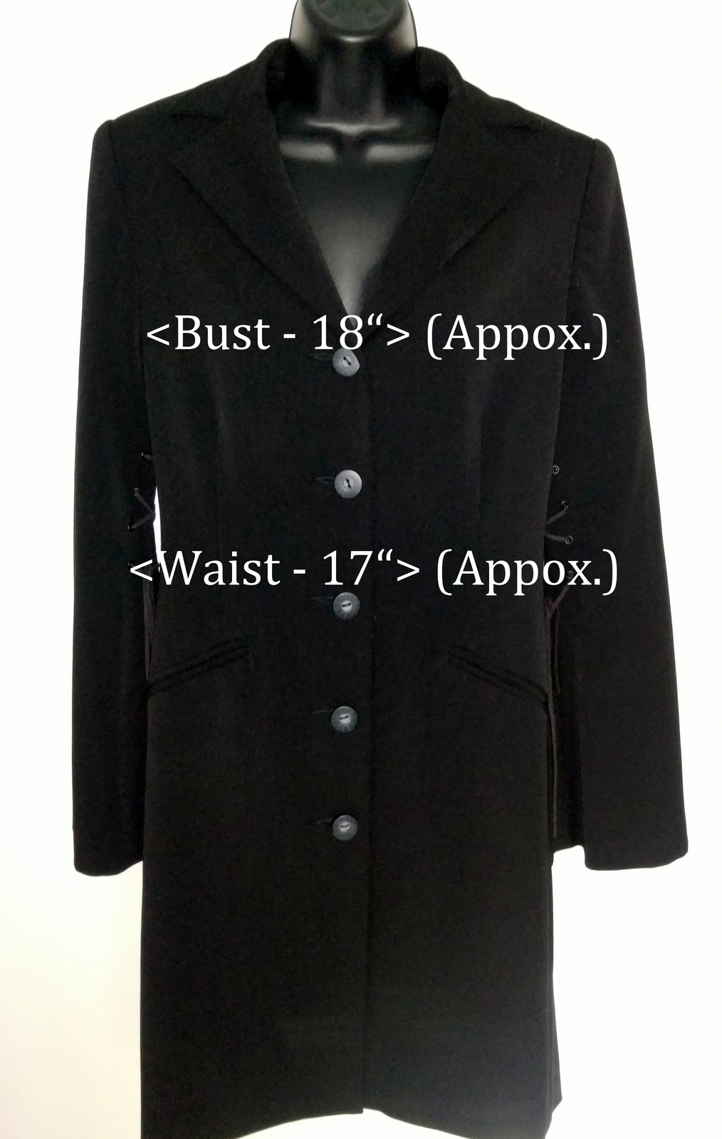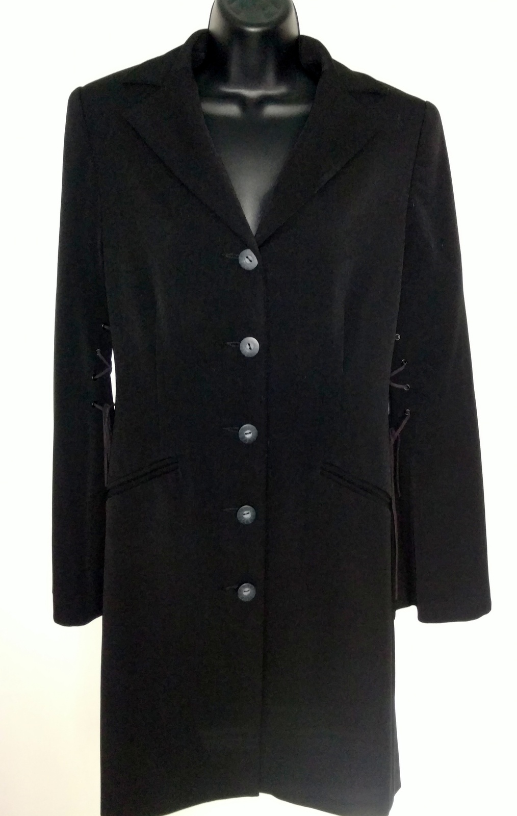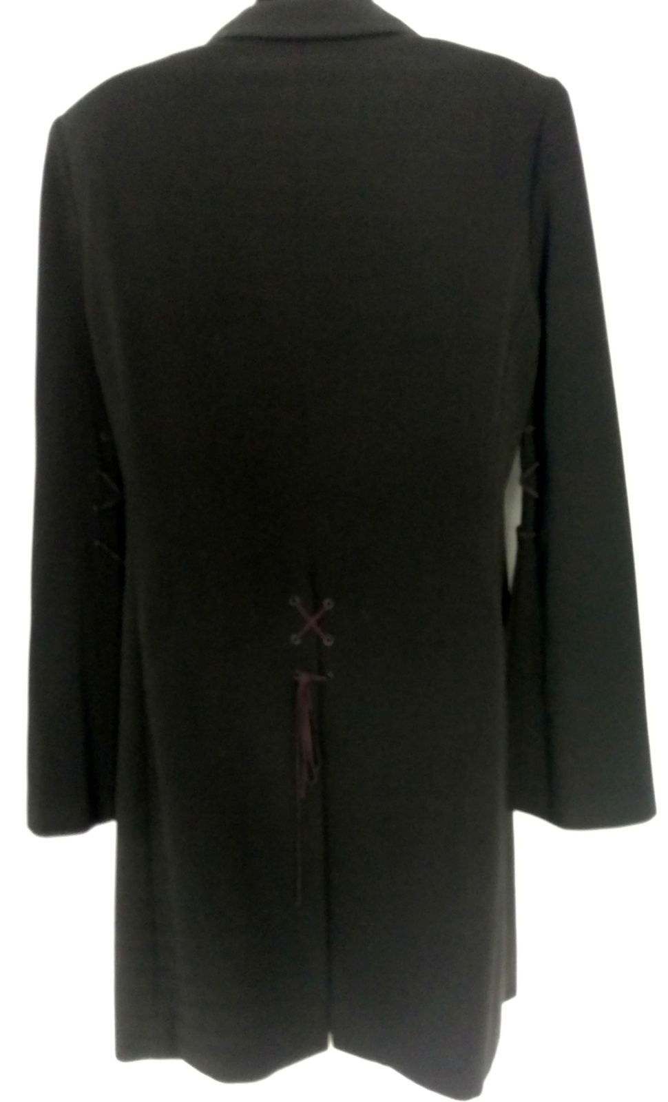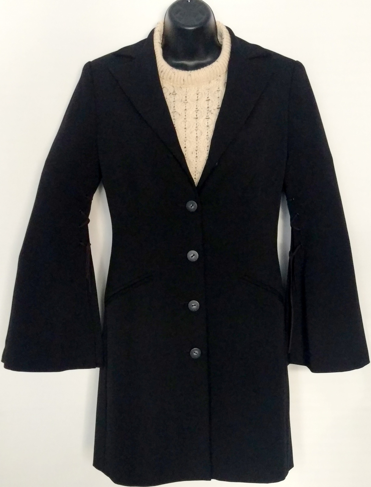 Stylish five-button front closure coat. Modern fit with notched lapel and two front welt pockets. Flare sleeve with Chic lace-up detail design (see photo). Center vent (includes lace-up detail design above vent), in back, fully lined; Coat is in great "like new" condition.
