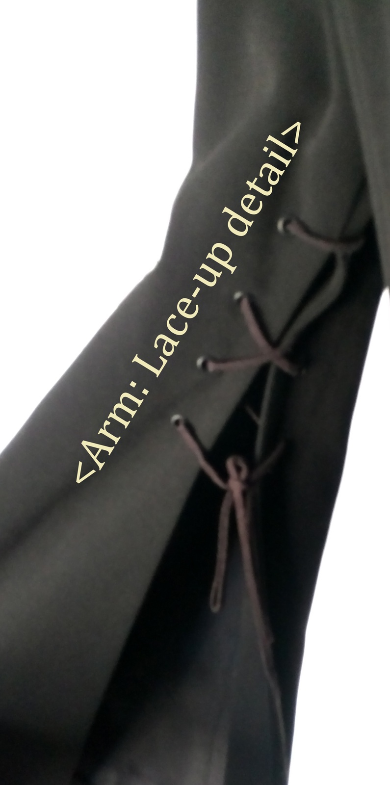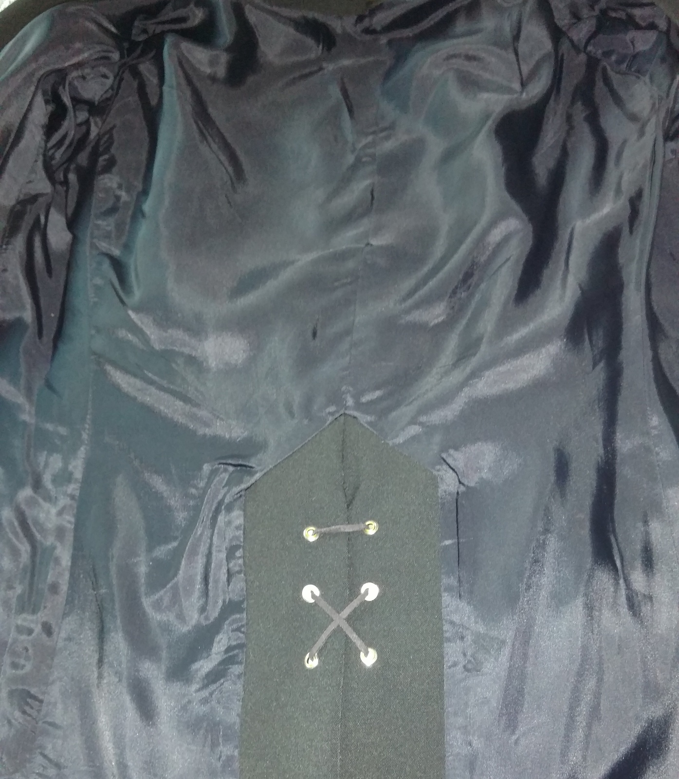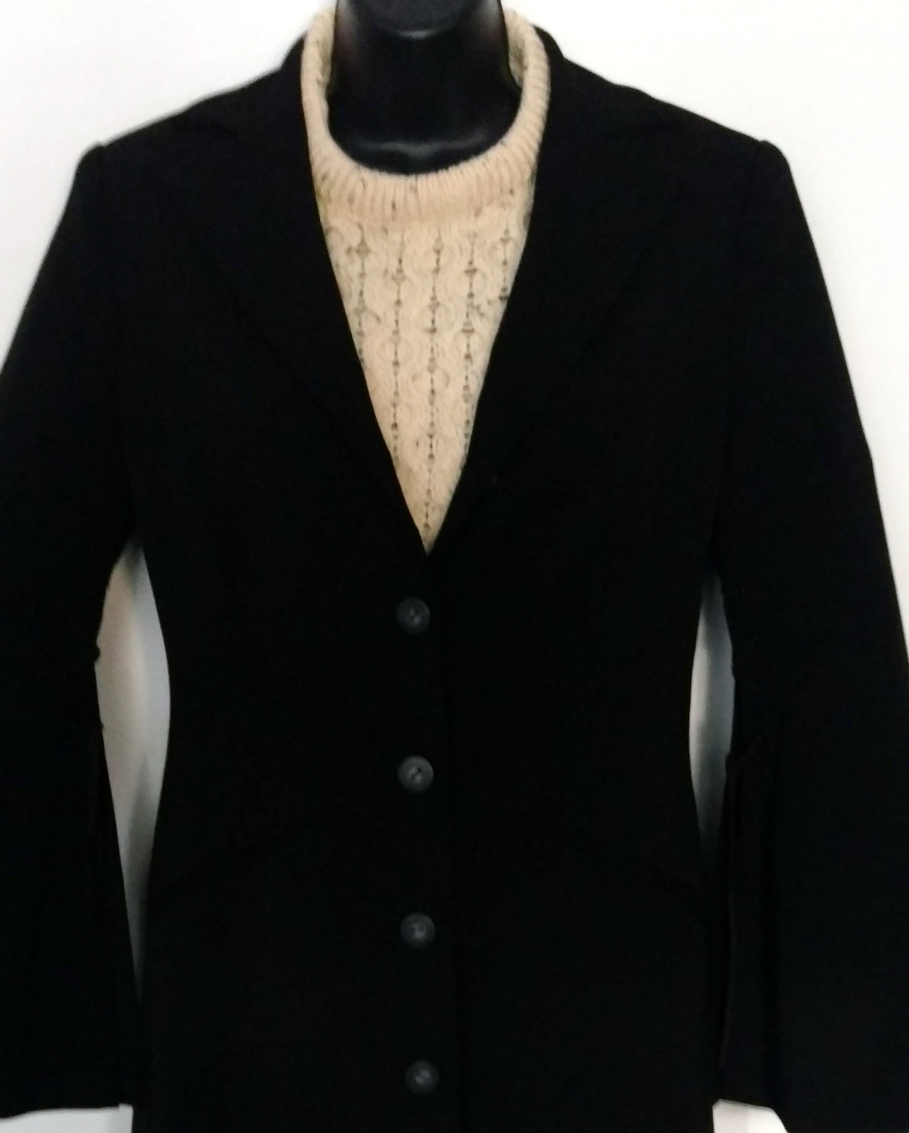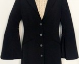 Stylish five-button front closure coat. Modern fit with notched lapel and two front welt pockets. Flare sleeve with Chic lace-up detail design (see photo). Center vent (includes lace-up detail design above vent), in back, fully lined; Coat is in great "like new" condition.