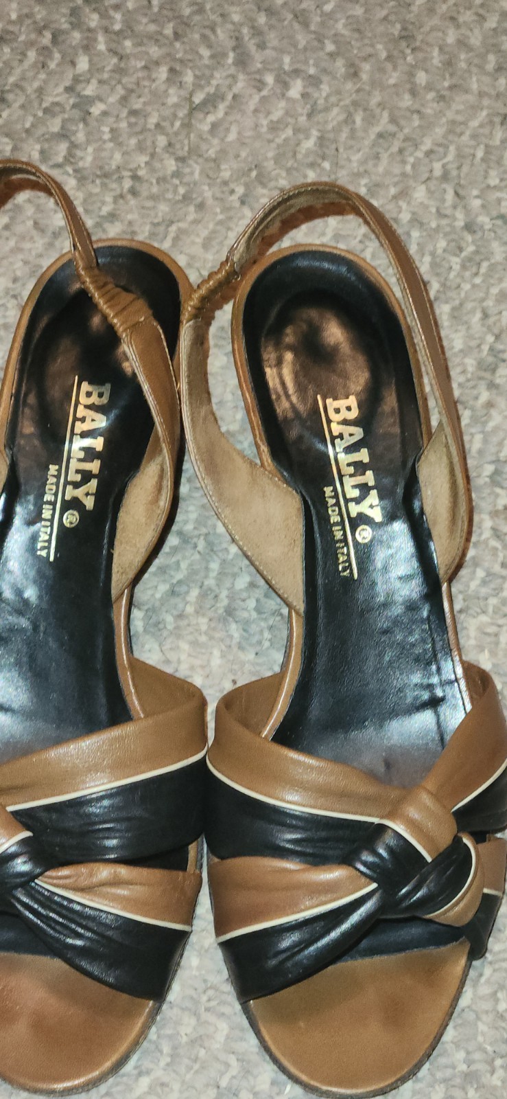 Good used 9.5 size heels Bally. Italy Made. Leather. Brown and black knot over the top of the foot area.