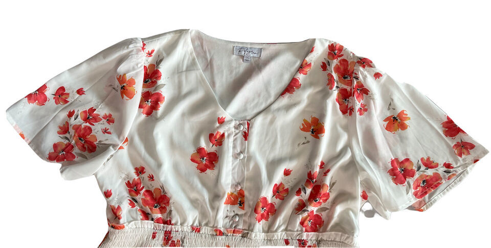 - Womens Polagram White Coral Floral Print Flowy Boho Ruffled Maxi Dress Plus 1X