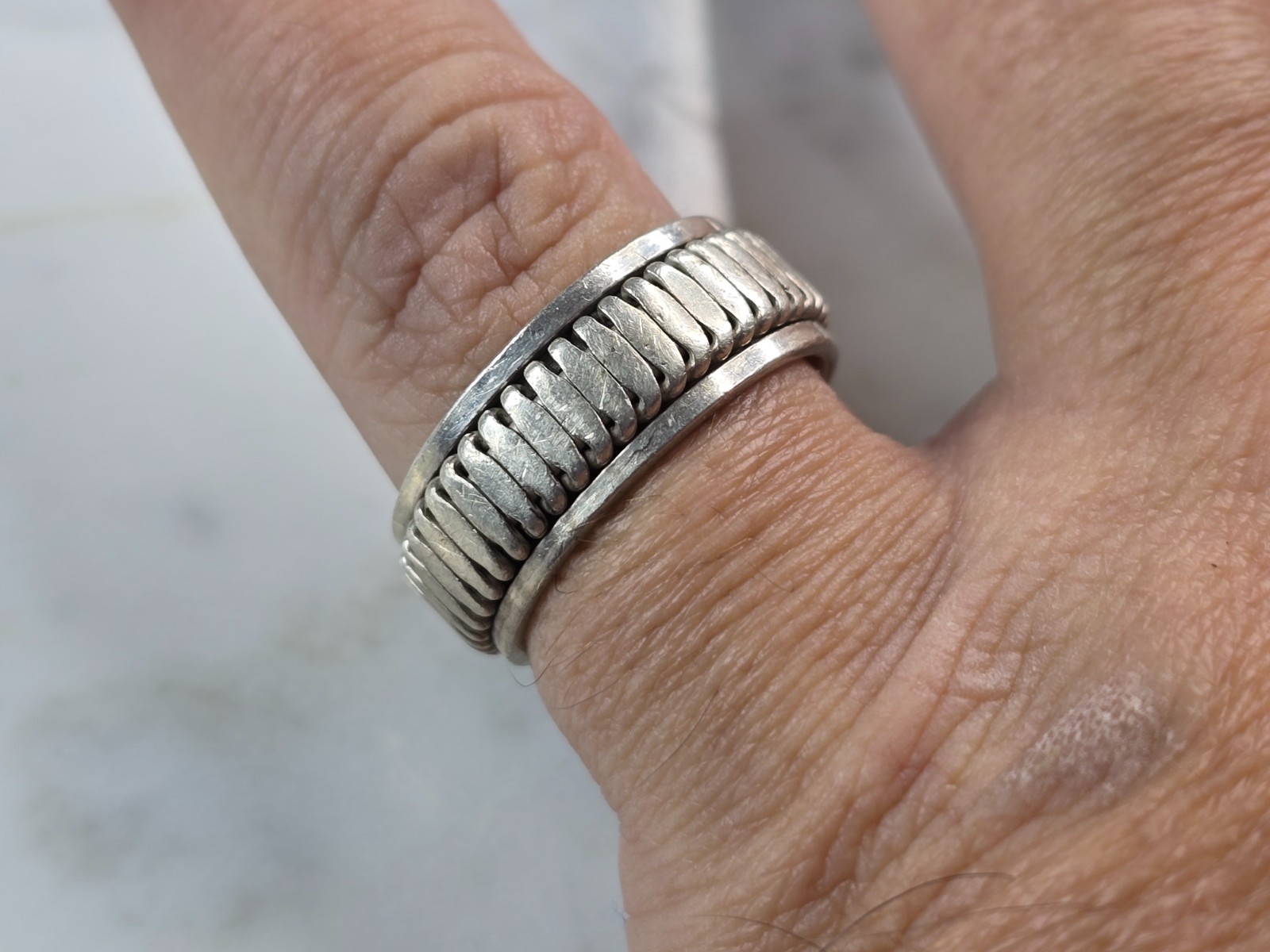 A WOMENS VINTAGE ESTATE STERLING SILVER MODERNIST RING. THE TOTAL WEIGHT OF THE RING IS 7.7g, AND IS A SIZE 7.0. THE WIDTH OF THE RING IS ABOUT 1/4". MAKES A GREAT GIFT FOR THAT SPECIAL SOMEONE. ANY QUESTIONS, PLEASE ASK. BE SURE TO CHECK OUT SOME OF OUR OTHER GREAT ITEMS FOR SALE.