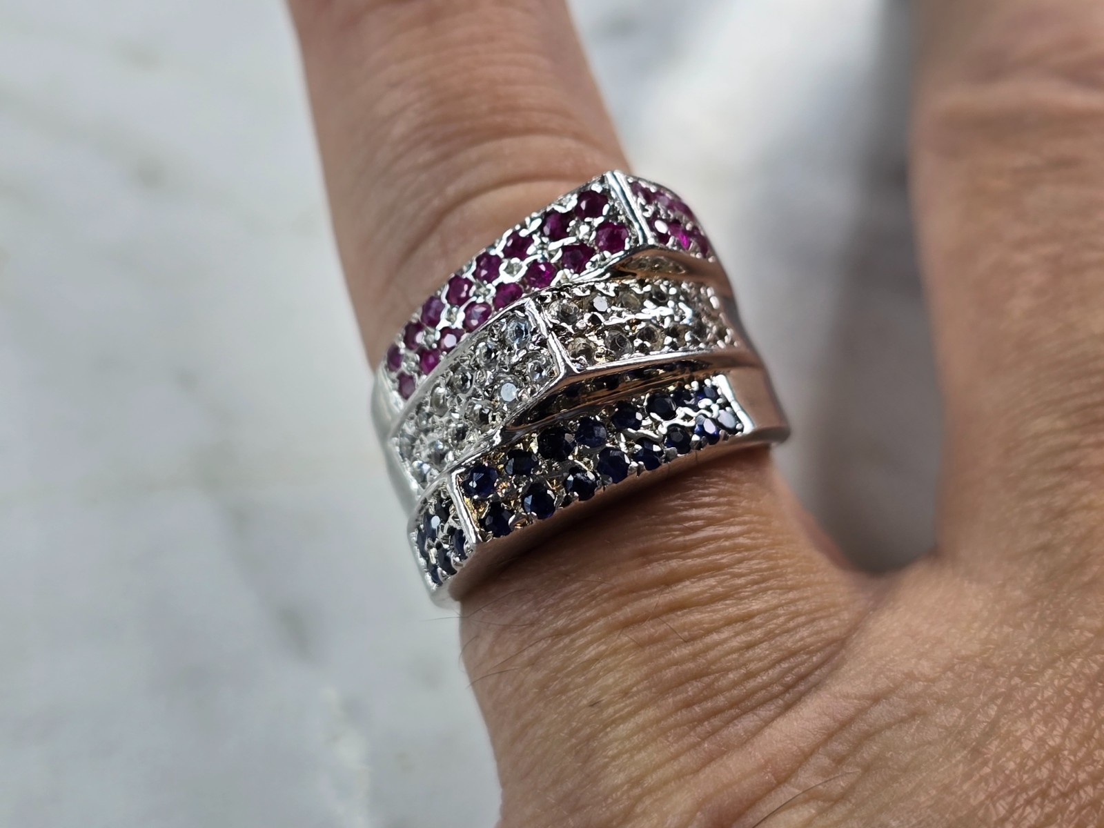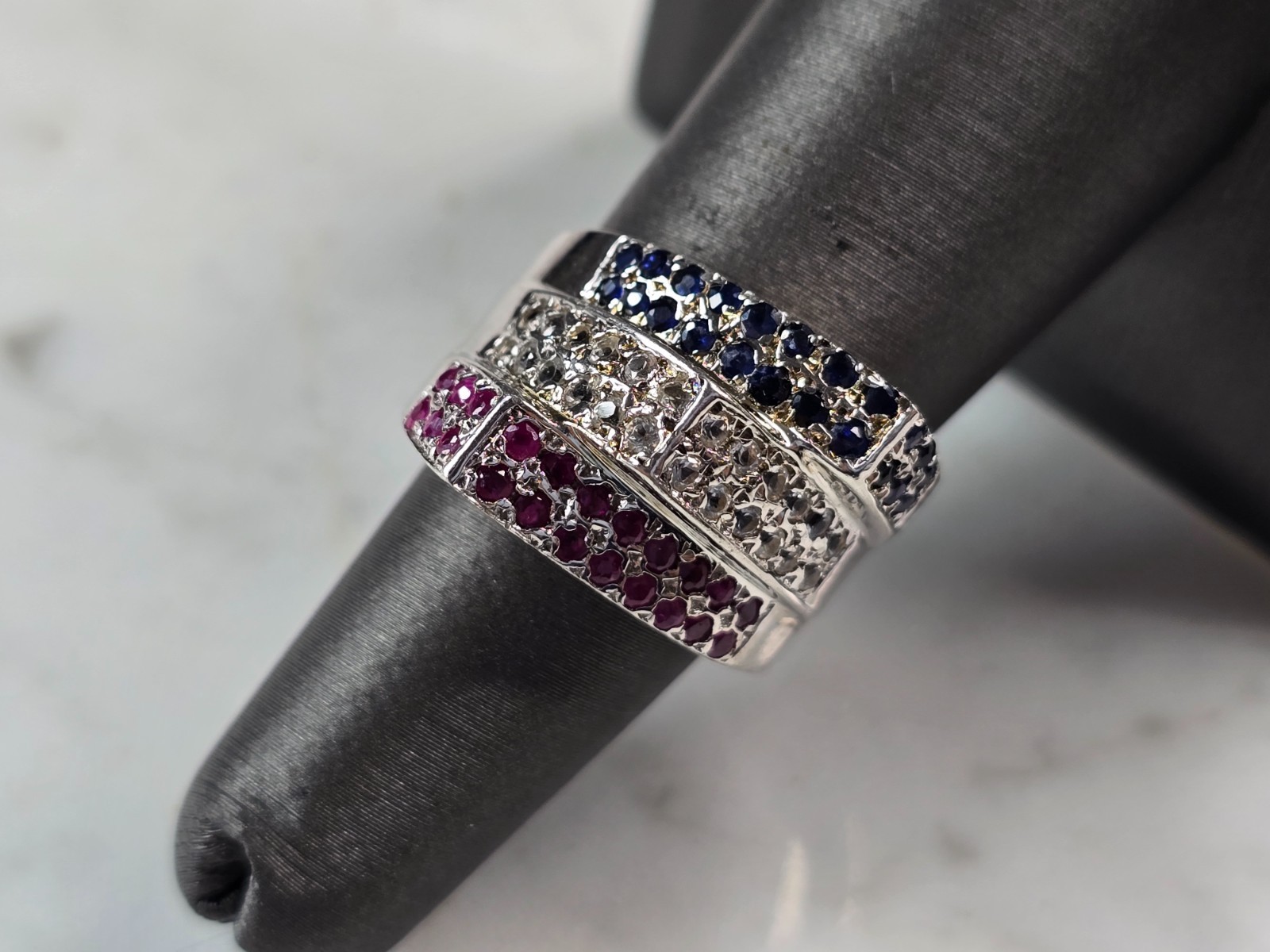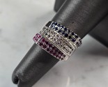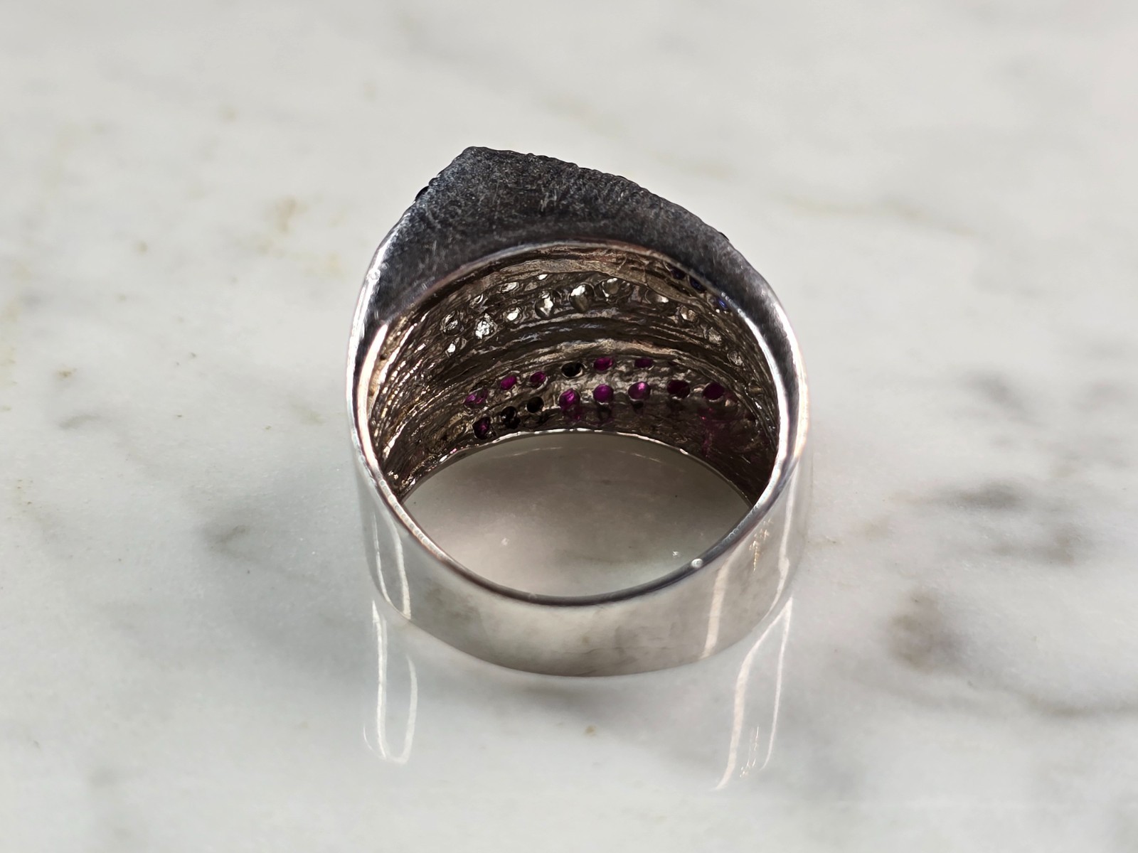 A WOMENS VINTAGE ESTATE STERLING SILVER MODERNIST RING. THE RING WEIGHS 9.1g, AND IS A SIZE 6.5. THE WIDTH OF THE RING IS 5/8". NOT SURE IF STONES ARE NATURAL OR MAN MADE. ANY QUESTIONS PLEASE DO NOT HESITATE TO ASK. BE SURE TO CHECK OUT SOME OF MY OTHER GREAT ITEMS UP FOR SALE. THANK YOU.