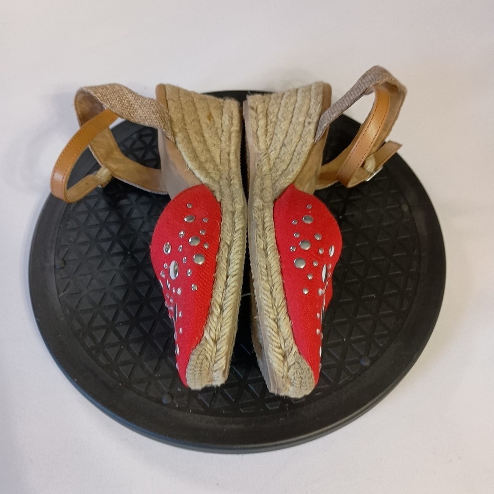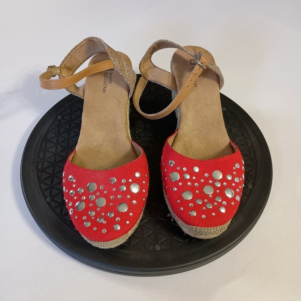 These White Mountain red espadrilles with mirrored dots are a stylish choice for casual occasions. The slip-on ankle strap in silver accents adds a trendy touch to the mid-height wedge heel. Perfect for summer, fall, or spring, these sandals are both fashionable and comfortable, making them a versatile addition to any woman's shoe collection. Normal wear.