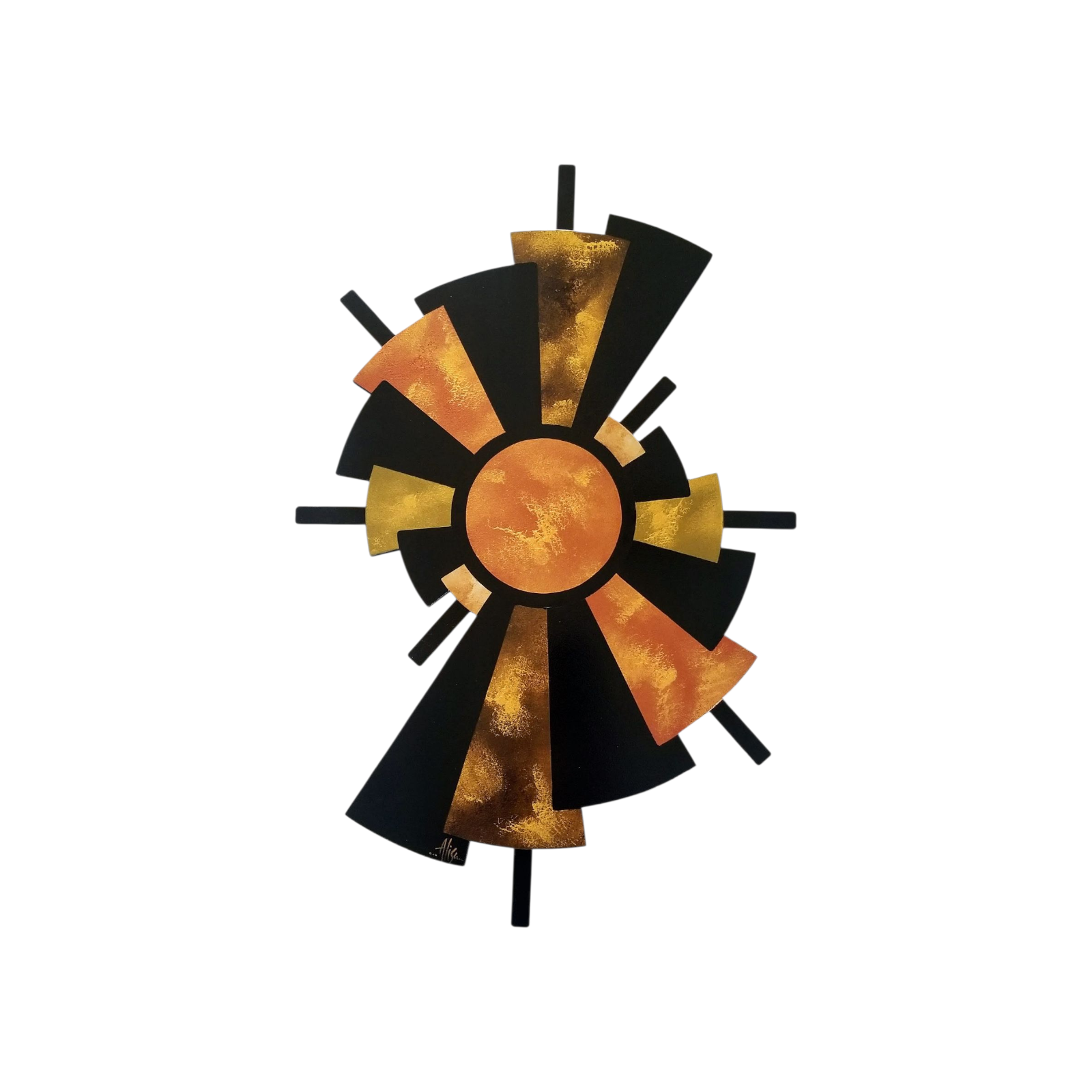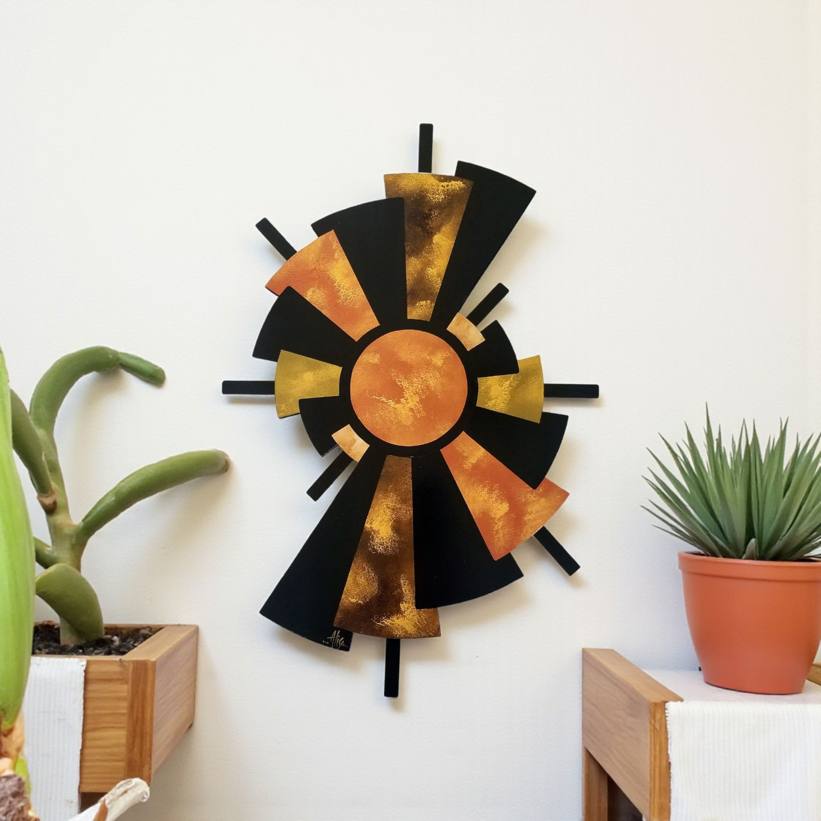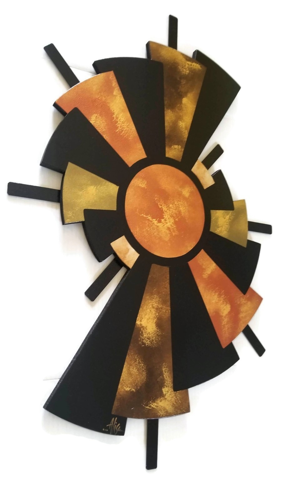This wood wall sculpture with metal accents by Alisa is a unique piece of contemporary art created, and hand painted by artist. This original sculpture features a brown, copper, gold, bronze and black color palette, with dimensions of 27x18 inches. Handmade in Florida, this skillfully handmade piece combines elements of modernism, Minimalism, and contemporary expression. The piece is signed by the artist and is designed as an interior wall sculpture, for your home or office. Perfect for adding a touch of artistry to any living space, or to give as a gift that will fit in nicely with most decor. Finished in a high gloss lacquer it is made to shine and last many decades to come. Order yours today!