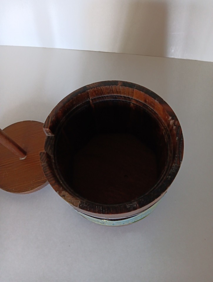 Crafted in Taiwan in 1984, this butter churn barrel is handmade and features a wooden-finished design. The barrel is small in size and has a cover. It is perfect for adults and is a great addition to any collection. Get your hands on this American-style butter churn barrel today! Normal wear. See Pictures. All sizes are approximate.