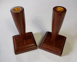 Add a touch of mid-century modernism to your decor with this pair of 4" square base tapered wooden candlestick holders. The retro pattern and brown color of the stained finish give these candle holders a unique and artistic look that will complement any occasion or subject. Crafted from high-quality wood, these candle holders feature a small size of approximately 7 inches in height with a tappered look and a classic 4" square shape base makes it Perfect for all occasions, these holders are a great addition to any collection of decorative collectibles. Get this one pair of candlestick holders today and add a touch of sophistication to your home decor. This is a pre-owned item with normal wear. See pictures. Sizes are approximate.