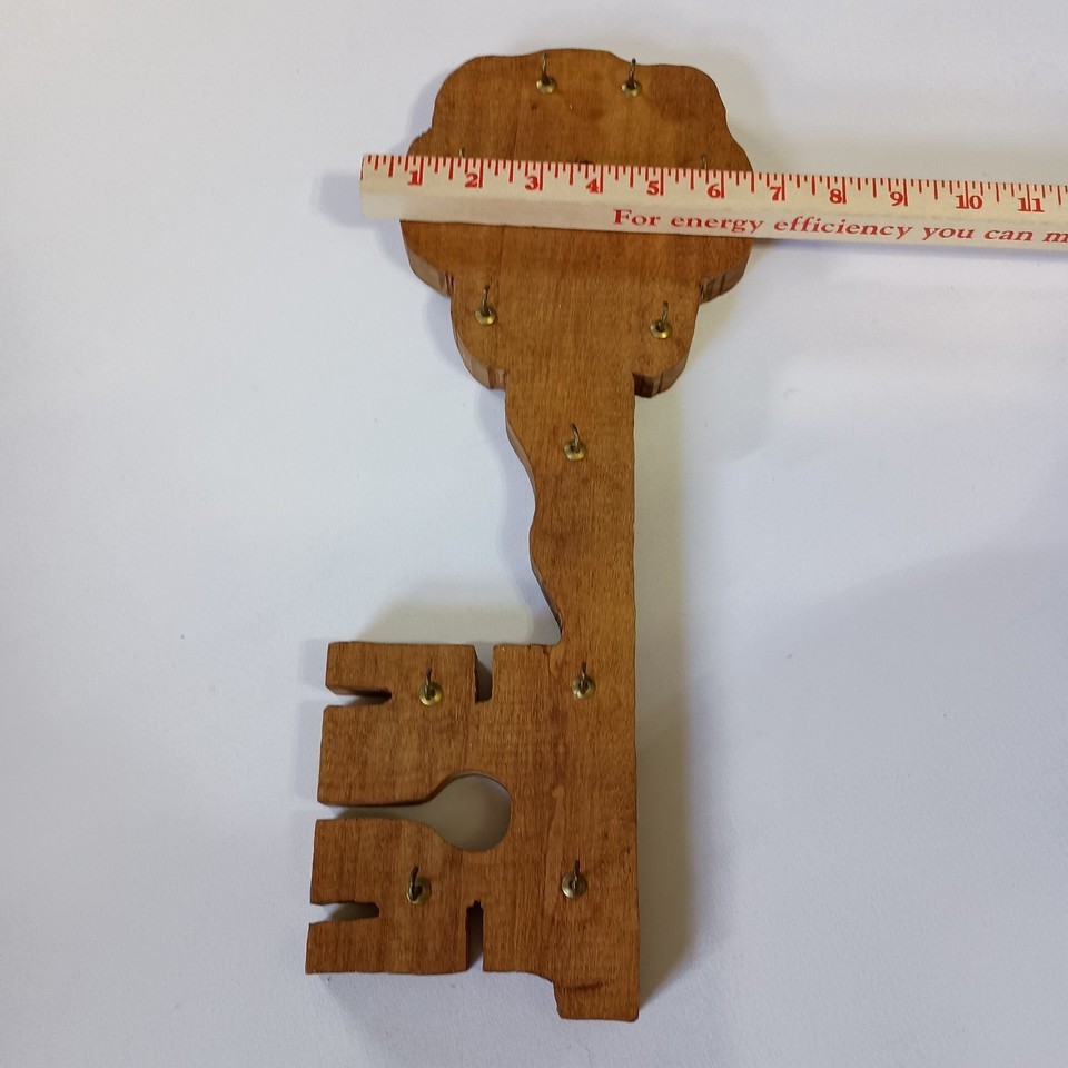 Add a touch of rustic charm to your home with this handcrafted solid wood key rack holder. The medium brown wood tone and hanging design make it a perfect addition to any key-shaped rack. Measuring at approximately 6 inches in width land 16 inches in height/length, this wall-mounted key rack is made of high-quality wood and requires no assembly. The handmade design and unknown country/region of manufacture add to the unique and authentic feel of this piece. Normal wear. See Pictures