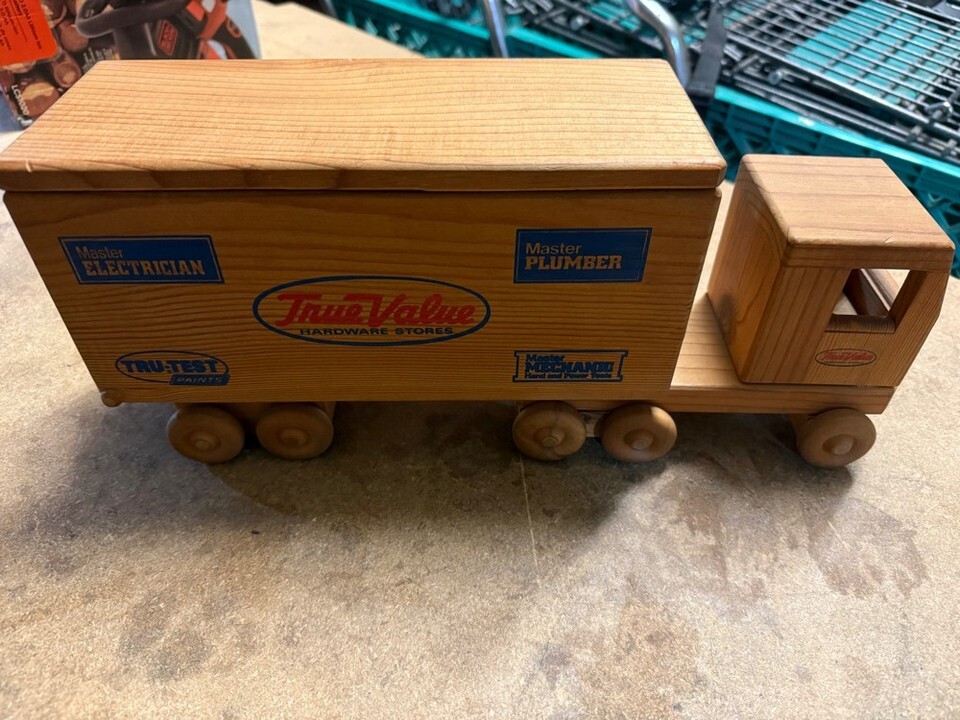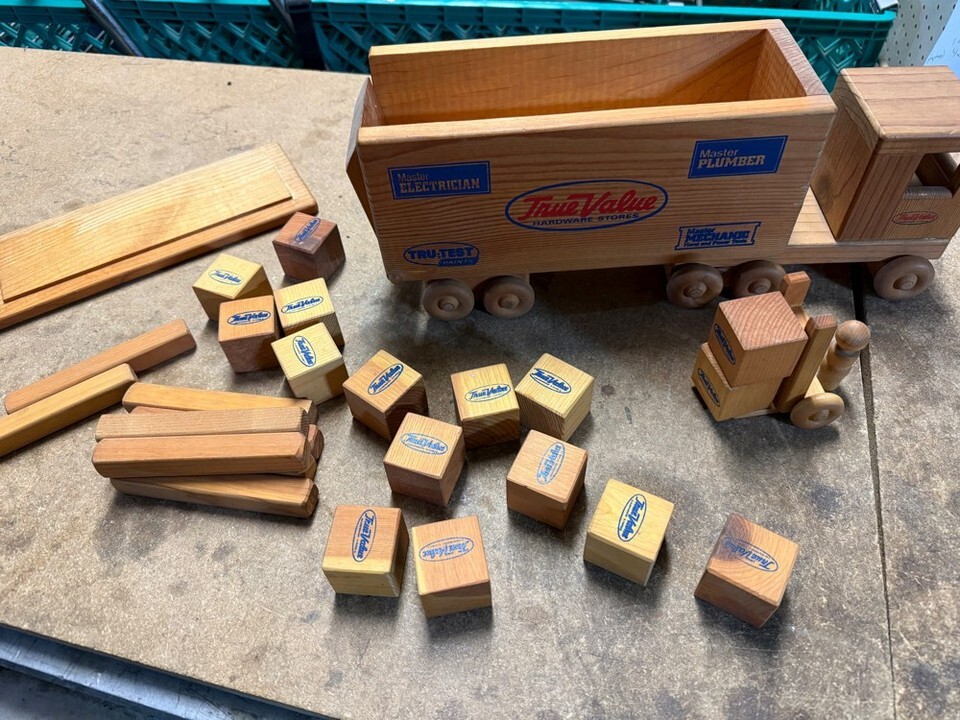 Very Rare True Value Hardware collectable Semi Truck made of wood by Pinehouse Toys. Comes with boxes, lumber, and cart as shown in the photos.