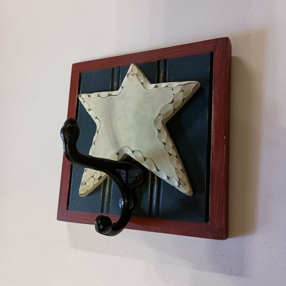 This Wooden Star Wall Hook is a decorative and functional addition to any home, featuring a traditional design with a Western theme. The black wrought iron wall hanger is approximately 5 1/2" x 5 1/2" in size and made of wood, giving it a rustic country style. The multicolor hook is perfect for hanging items in a bedroom, kitchen, or entryway while adding a touch of charm to the space. Normal wear.