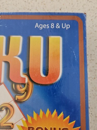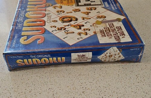 Factory sealed packaging, includes 100 Puzzles, Wood Playing Pieces, and a Sand Timer
