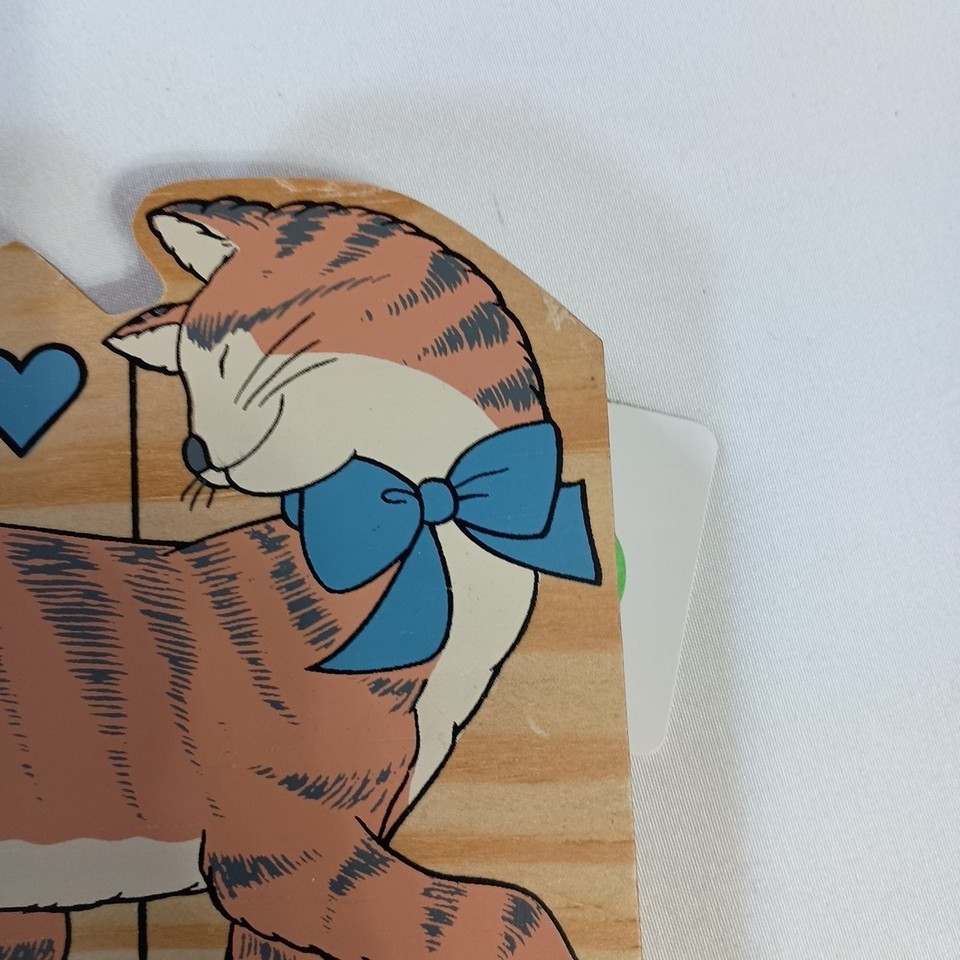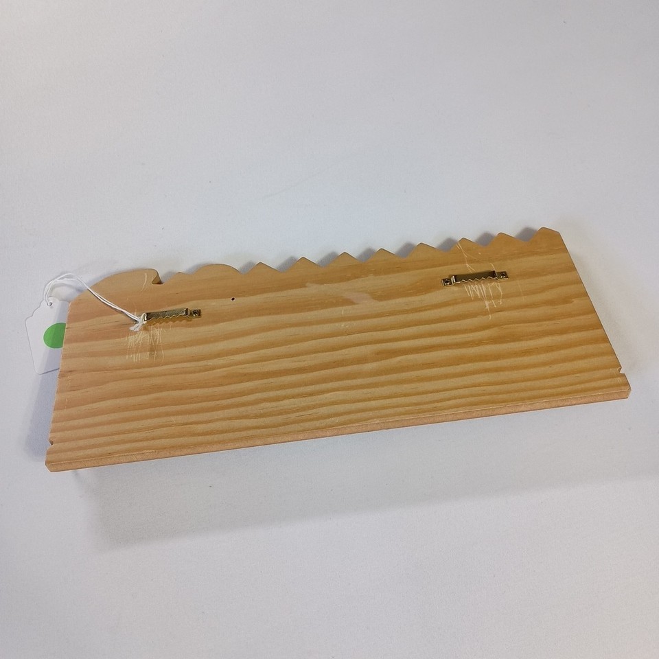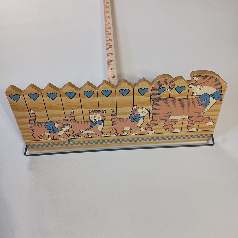 This handmade wooden towel holder hanging rack features a charming design of a mom cat and kittens, perfect for cat lovers and fans of country cottagecore aesthetics. The rustic wood material adds a touch of warmth and elegance to any kitchen or bathroom decor. The unique and whimsical animal class of cats makes this piece a delightful addition to any collection of cat-themed items. Normal wear. Sizes are approximate.