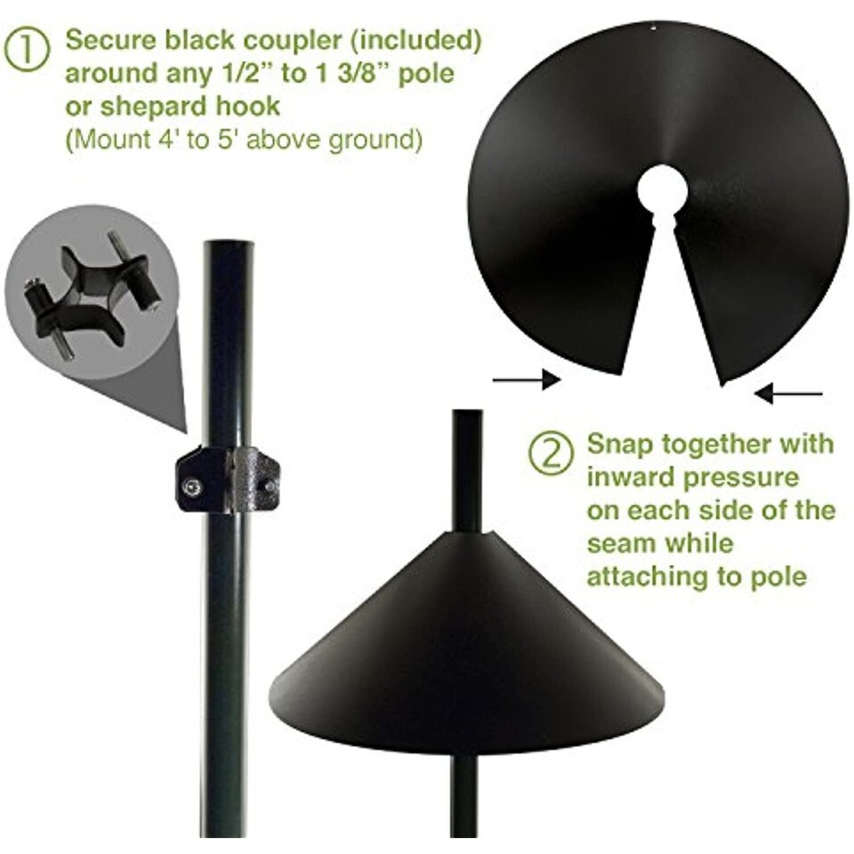WoodLink is the exclusive licensee for the manufacturing of birding products to the design specifications of the National Audubon Society. The ultimate 18-inch wrap around black metal squirrel baffler is made of textured powder coated steel. Installs easily. Raccoon resistant. Defeats squirrels every time. Mount 4 to 5-feet above the ground. No need to remove bird feeder when mounting. Secure black coupler (included) around any 1/2-inch to 1-3/8-inch pole or shepherd hook. Snaps apart with inward pressure on each side of the seam.