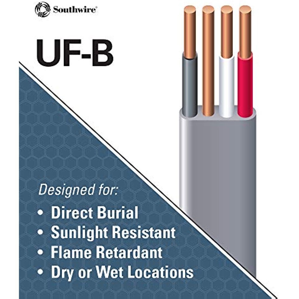 Permitted for use in direct burial applications such as exposed or concealed wiring in damp, moist, wet, dry and corrosive locations as specified by the NEC. Southwire underground feeder cable can be used in applications such as general branch wiring, new wiring, and replacement wiring. Southwire's type UF is a thermoplastic non-metallic sheathed cable. Solid copper conductor. Type TW conductor insulation color coded with thermoplastic overall jacket. UF Thermoplastic insulated 60? C wet or dry locations. UFB Thermoplastic insulated with conductors rated at 90? C.