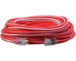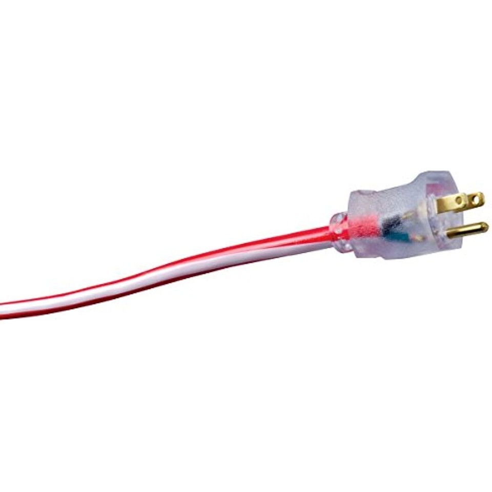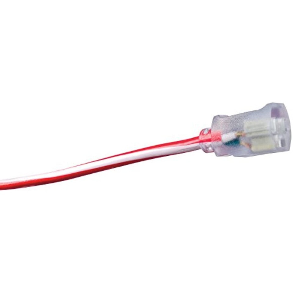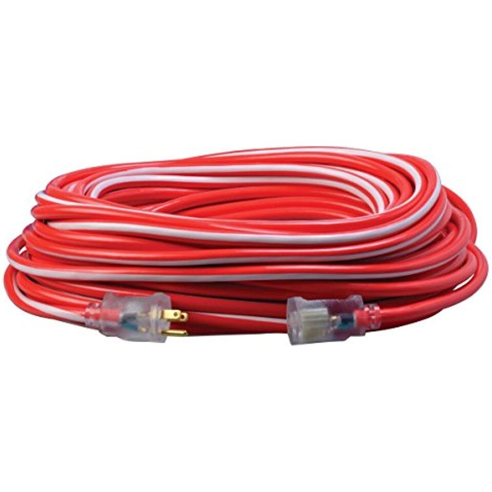 Coleman Cable 02549 100-Feet 12/3-Wire Gauge neon stripe outdoor extension cord with lighted ends, red and white increase safety awareness and help to prevent jobsite loss or theft with neon stripes outdoor extension cords. Each extension cord features a dominant color and an extruded colored stripe that runs the length of the cord. all stripes extension cords have a power indicator light in the receptacle to show that the power is on. Each is rated at 15-AMP 125-Volt and wiring size is 12-Gauge with 3 conductors