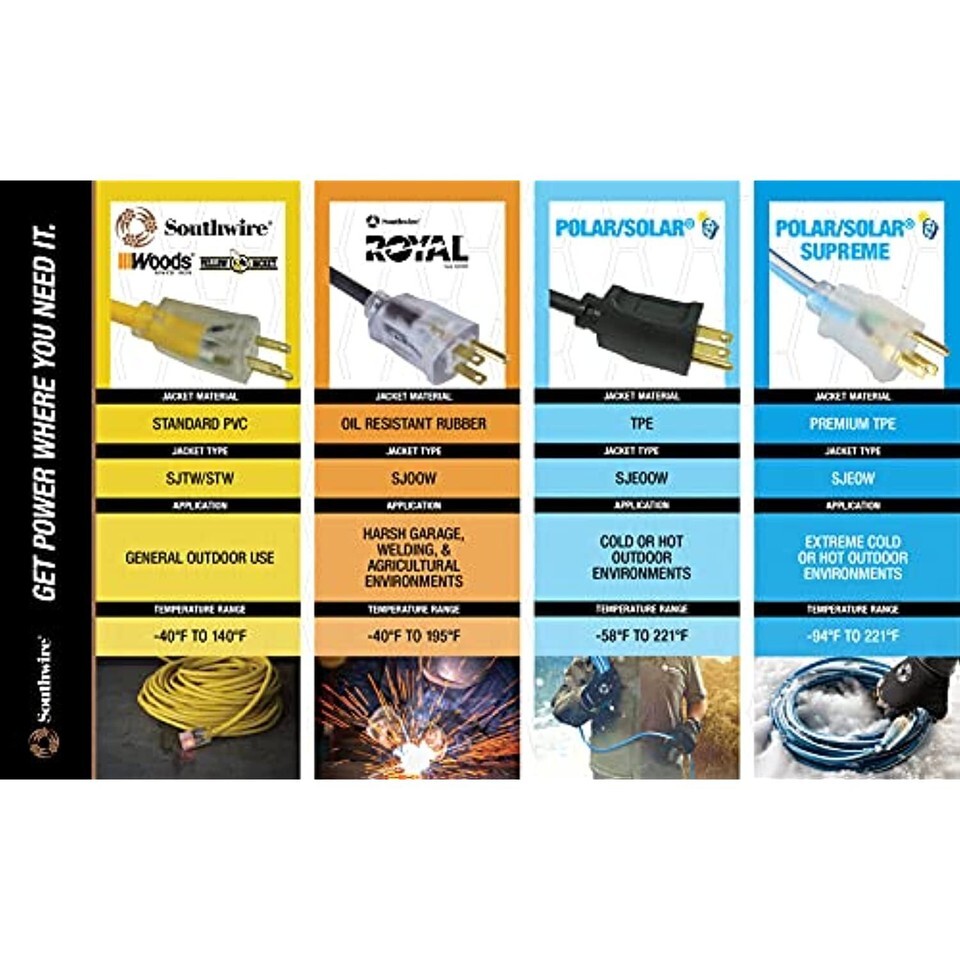 All purpose extension cord for indoor and outdoor use suitable for jobsites, workshops, warehouses, and more