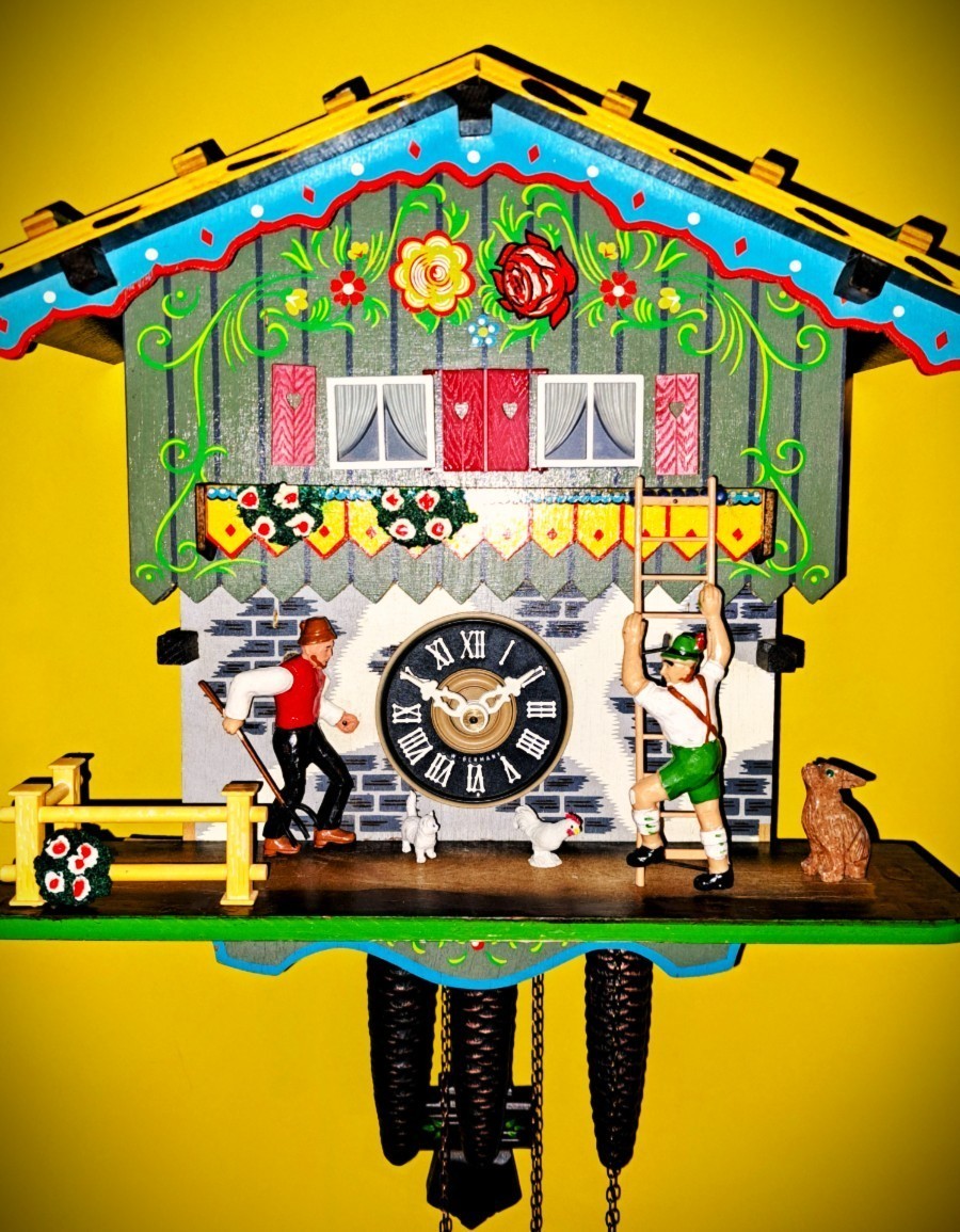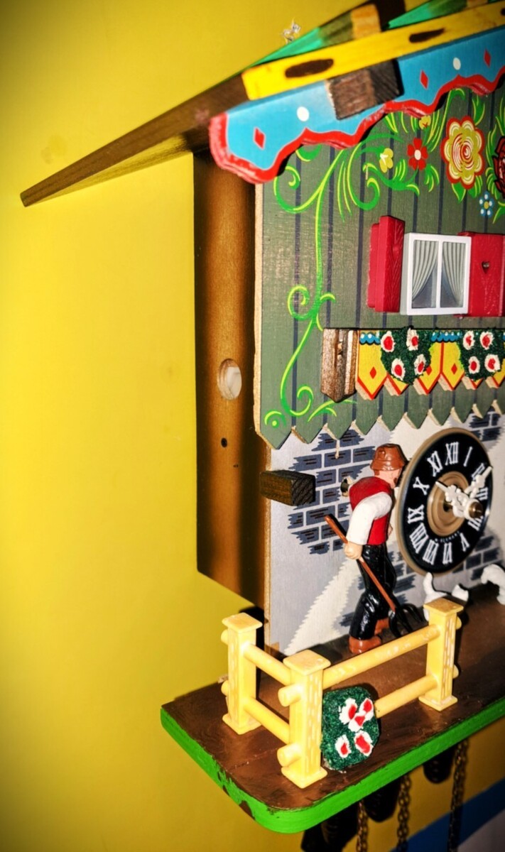 and the cuckoo birds comes out and the farmer pitchfork moves up down,