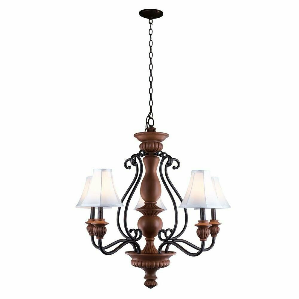 Item Notes: Add light and decorative accent to your room with this 5-light chandelier. Perfect for kitchens, dining rooms, bedrooms, foyers or applications in which a decorative element is desired. For more than 30 years, World Imports has brought a higher standard of style and sophistication to interior designers around the world. Each piece, whether traditional classic, contemporary or strikingly eclectic, is an individual work of art. With World Imports original collections, you have a unique resource for lighting of unsurpassed quality, design and workmanship. All metal construction with antiqued gold finish Elegant white fabric shades add an atheistic appeal Uses five 60-Watt maximum, B10.5 candelabra based bulbs sold separately Compatible with any standard incandescent style dimmer switch UL certified for safety and quality Compatible with CFL or LED bulbs Mounting hardware included Dimensions Maximum Hanging Length (in.) 72 Product Depth (in.) 34.37 Product Height (in.) 32.91 Product Width (in.) 34.37 Shade Diameter (in.) 5
