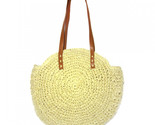 Woven raffia bag with magnetic closure lined pouch. Approximately 18" in diameter with a 12" faux leather strap.