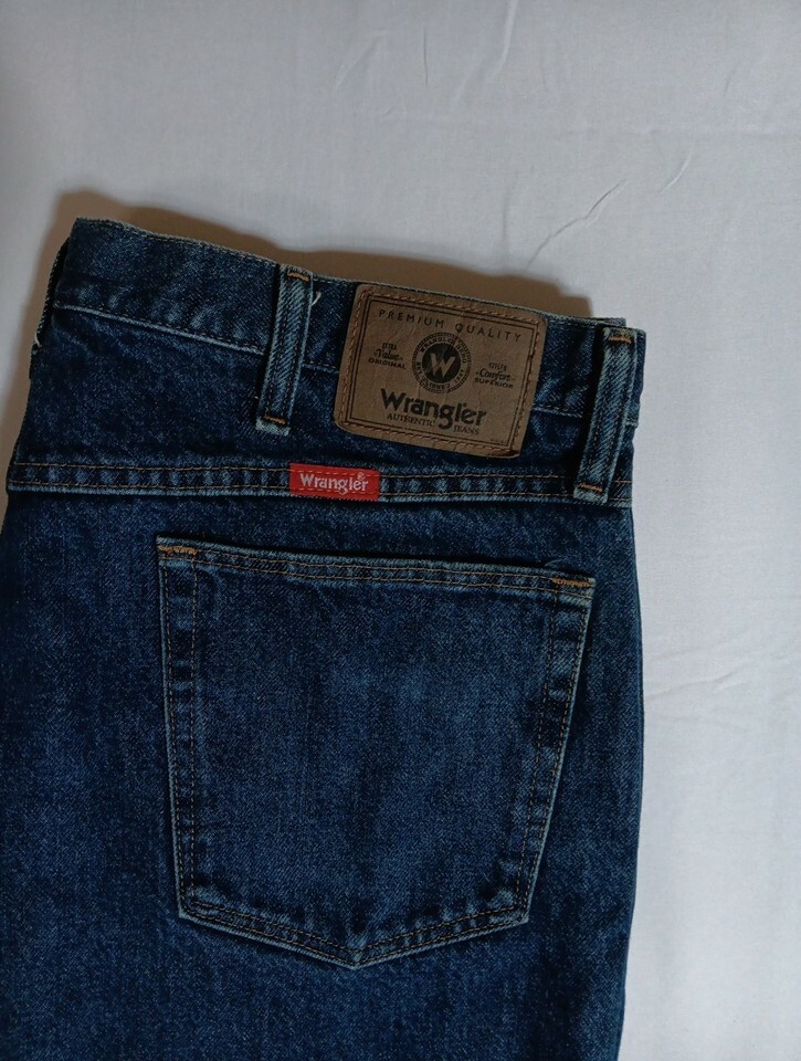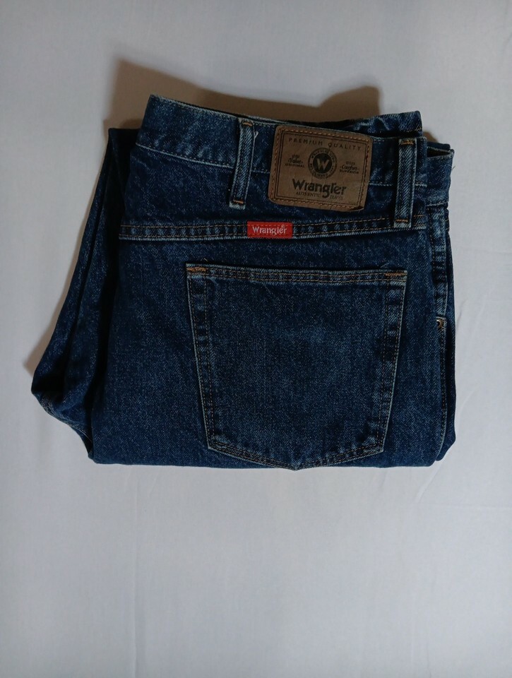 The Wrangler Men's Jeans in size 38X32 are a classic and durable choice for men looking for a reliable denim option. The dark wash and solid pattern give these jeans a timeless look, while the regular fit and straight leg style offer a comfortable and flattering silhouette. With a zip closure and 5-pocket design, these jeans are both functional and stylish, perfect for everyday wear. Made from cotton denim, these machine washable jeans are easy to care. Normal wear.