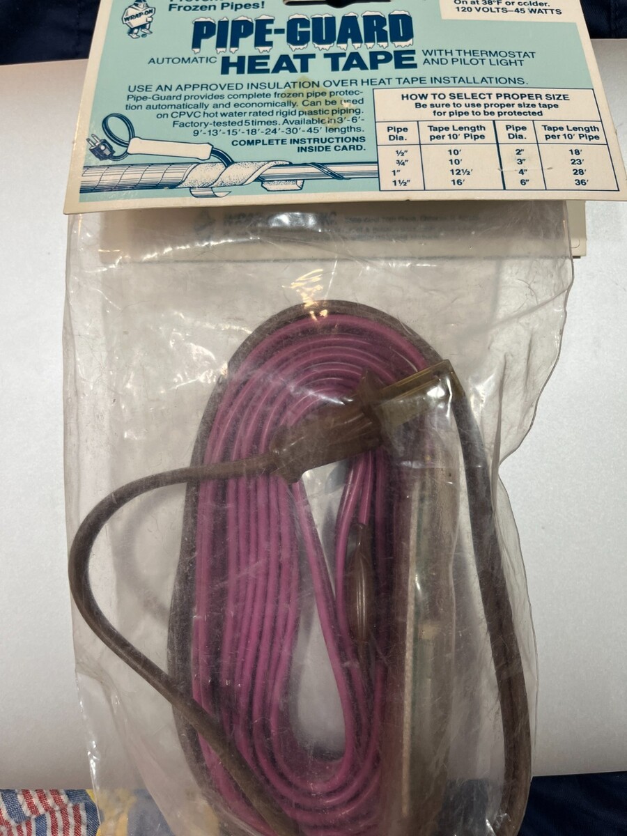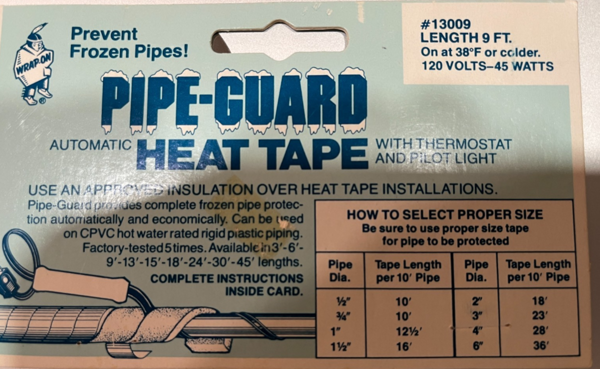 - Wrap-On Pipe-Guard Automatic Heat Tape, 9ft long, On @ 38°F or Colder, 45W, 120V