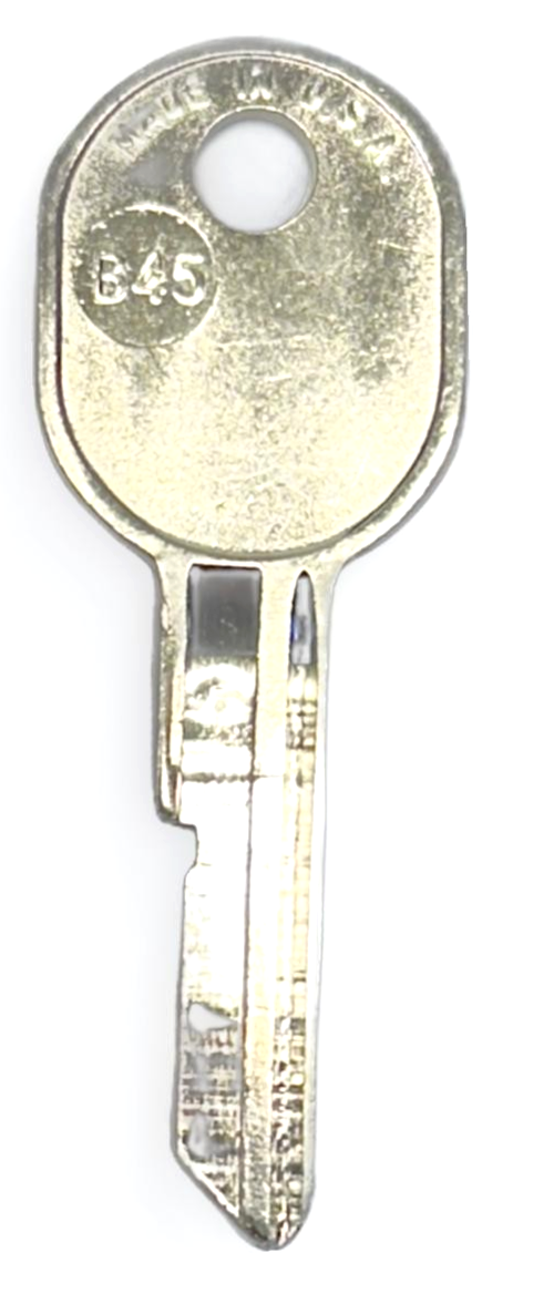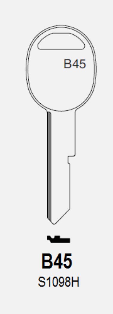 In summary, the B45 / S1098H key is a multi-brand General Motors (GM) mechanical key blank for the door, trunk, and glovebox locks of numerous cars and trucks from the 1970s?2000s.