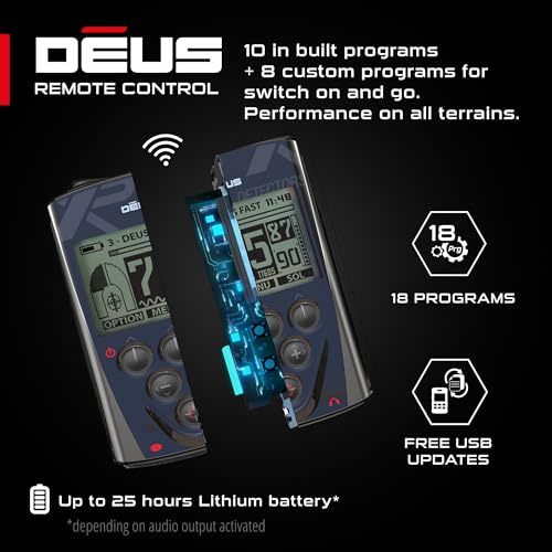 Product description: XP Metal Detectors DEUS Remote Control or Control Module with 10 pre-set factory programs to suit all terrains! Plus 8 empty program slots to save custom programs offering even more possibilities. It allows you to adjust the internal settings of your DEUS. It can be fixed on the stem or stored in a pocket ? The remote control is not required if you choose to use the WS4 headset to control your detector. Functional when you turn it on for the first time. Once you have chosen one of the 10 factory pre-set programs, you can customise the settings if you wish by changing a wide variety of parameters: discrimination, sensitivity, frequency, iron volume, reactivity, audio response, and notch reject / accept. You can adjust the ground balance manually, pumping, tracking or beach mode. Coil configuration: Pair up to 10 search coils by entering each individual serial number into the associated menu. Static modes allow you to detect without moving. It offers an advantage when hunting for metal pipes and large caches. Also known as an "Non Motion All Metal" mode.