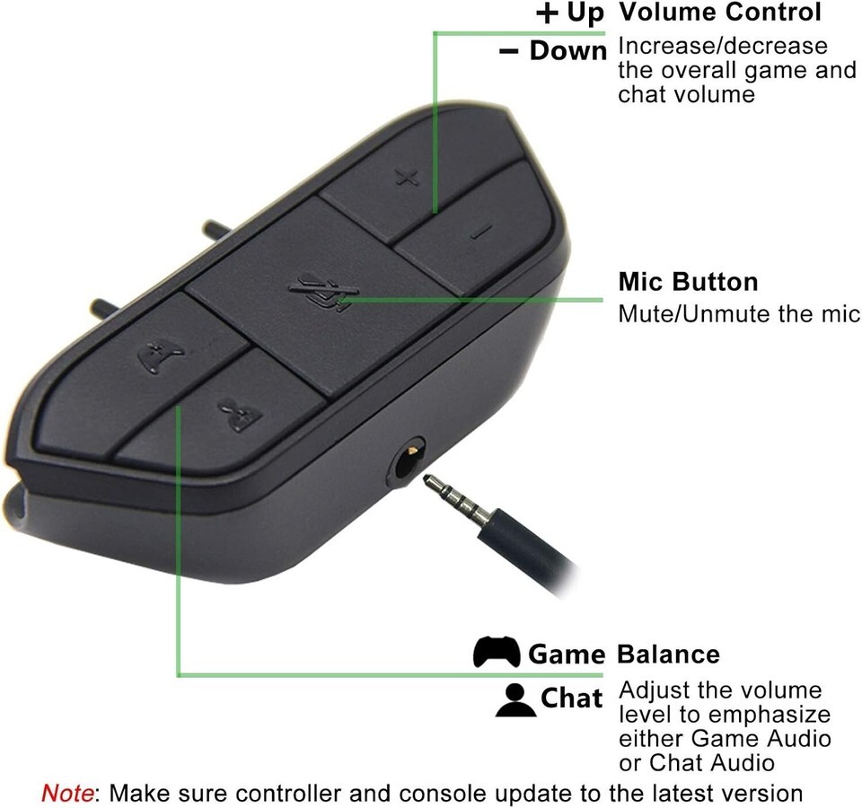 Instruction Made Simple: The controller figure logo on the adapter allows for separate balance of gaming and chatting sounds. Receive audible beeps when reaching maximum or minimum settings. Adjust volume effortlessly with plus minus icons and mute/unmute with the microphone logo.