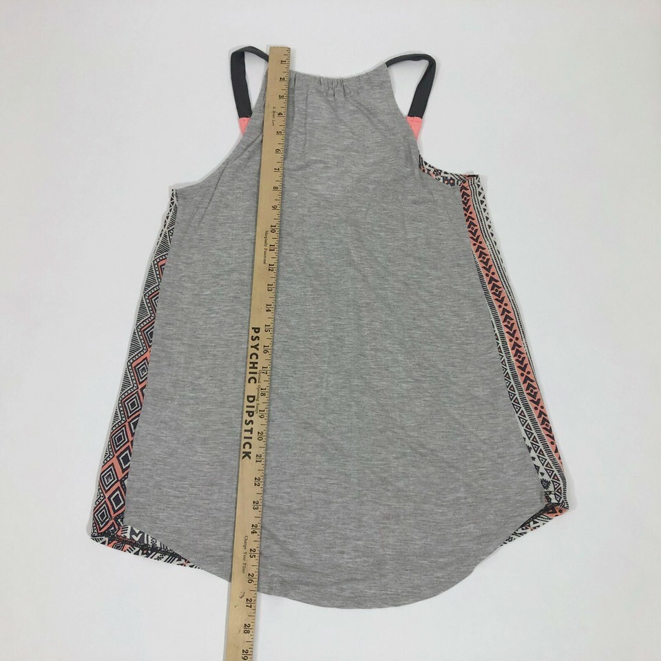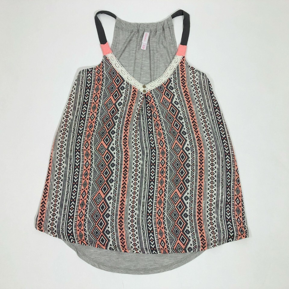 EUC, Xhilaration Hi-Low halter/tank top has a fun Boho geometric diamonds design in black, peach, cream on the front solid grey on the back. The front is accented with a cream crochet neckline border and 2 decorative buttons. This is a fun light weight summer top with no rips, tears, or stains. Hi-Low hemline.