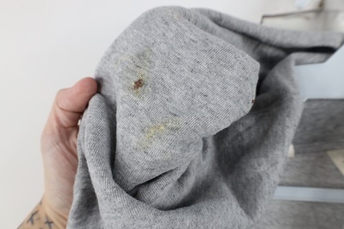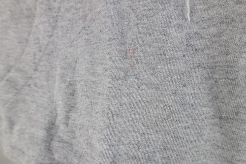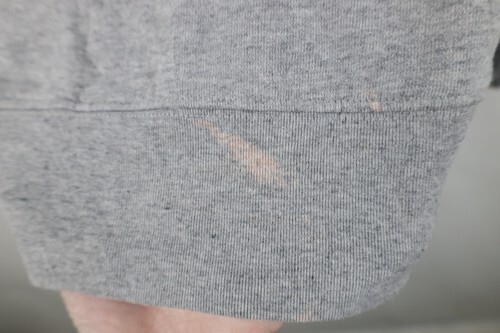 Bleach stains front bottom, back bottom. Stains pocket, inner hood. Dark spots throughout. Loose thread, distressed string. Hood, cuffs discolored. Graphics, color faded. Pilling