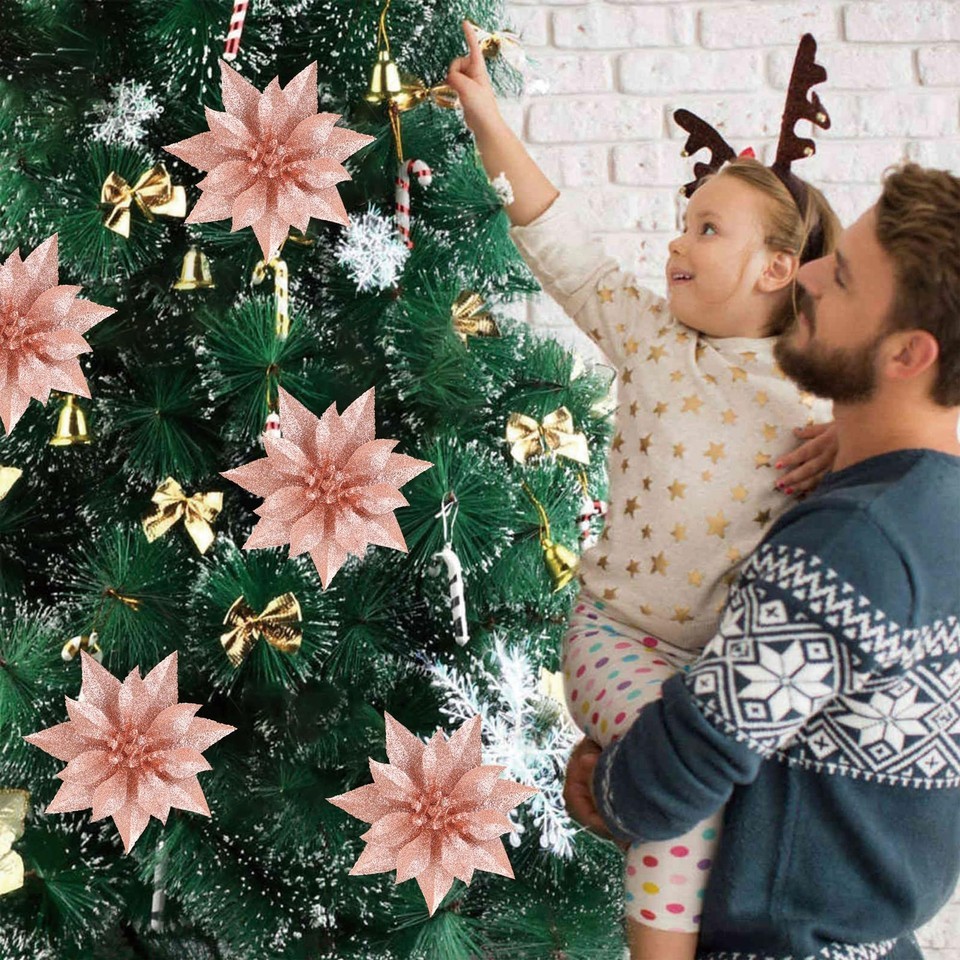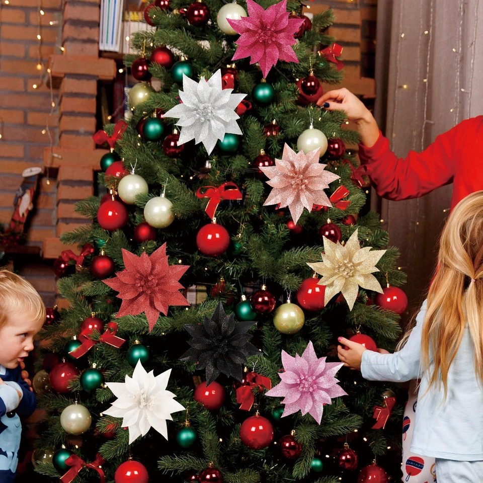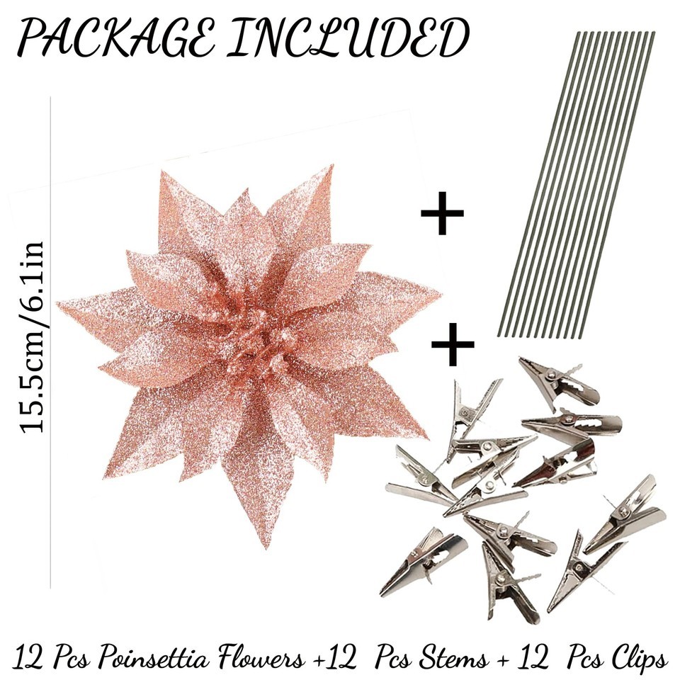 PACKAGE INCLUDED:Comes with 12 pcs champagne Christmas tree flowers + 12 pcs metal clips + 12 pcs stems.Each champagne flower for Christmas tree is approximately 6.5" in diameter and full of glitter powder, sparkly and gorgeous.