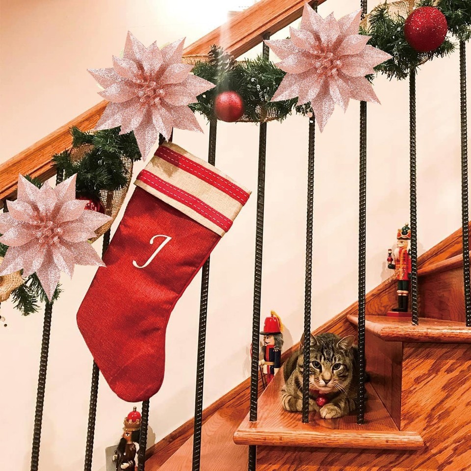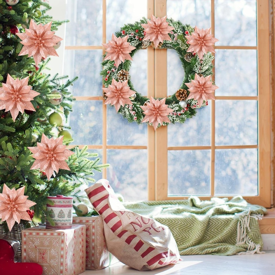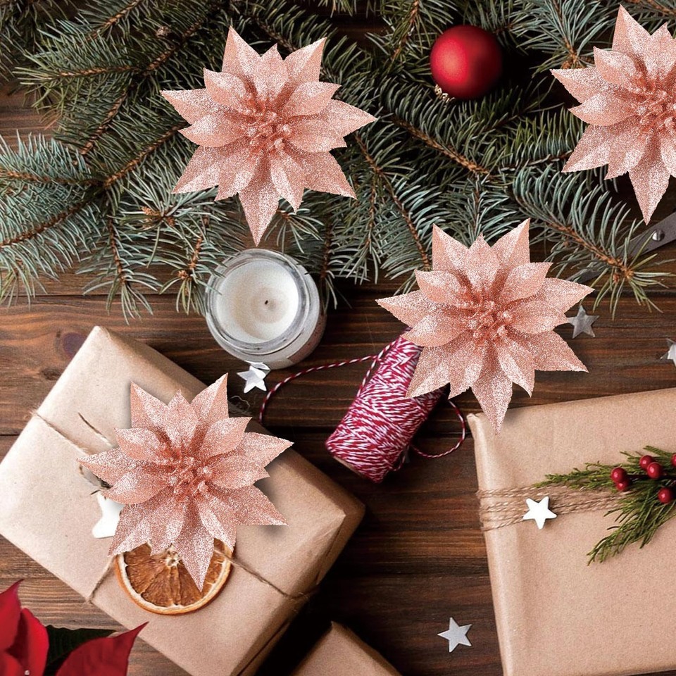 EASY DECORATION:These champagne Christmas flowers for tree comes with clips and stems that allow you to attach them to your Christmas tree effortlessly.Just insert the clip or stem tip into the root of the champagne poinsettia flowers then apply them on anywhere you like.Sparkling in the winter,these champagne christmas ornaments will add an elegant warm touch to your holiday decor and enhance the festive atmosphere.