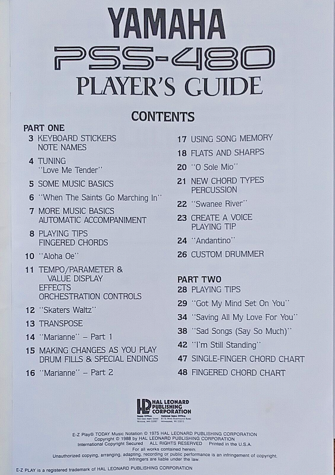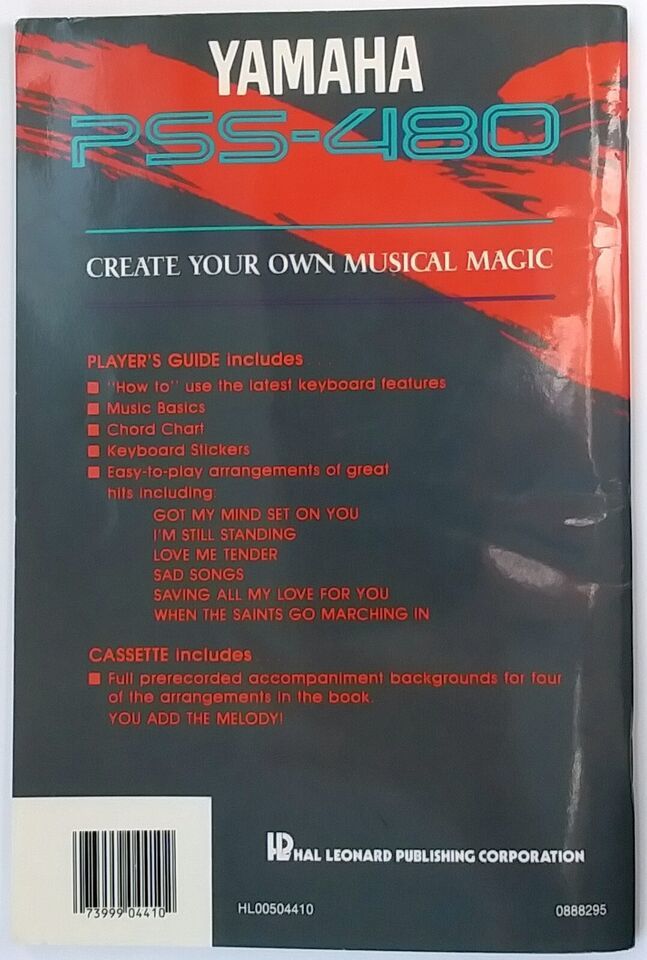 This is a rare book for the Yamaha PSS-480 Portatone electronic keyboard. It covers some of the features of this great FM synth from the 80's, with many pages of music as well. It originally came with a cassette tape and some keyboard stickers, but I do not have these.