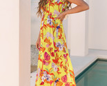 - Yellow Cheetah Plant Print Shirred Button V Neck Maxi Dress