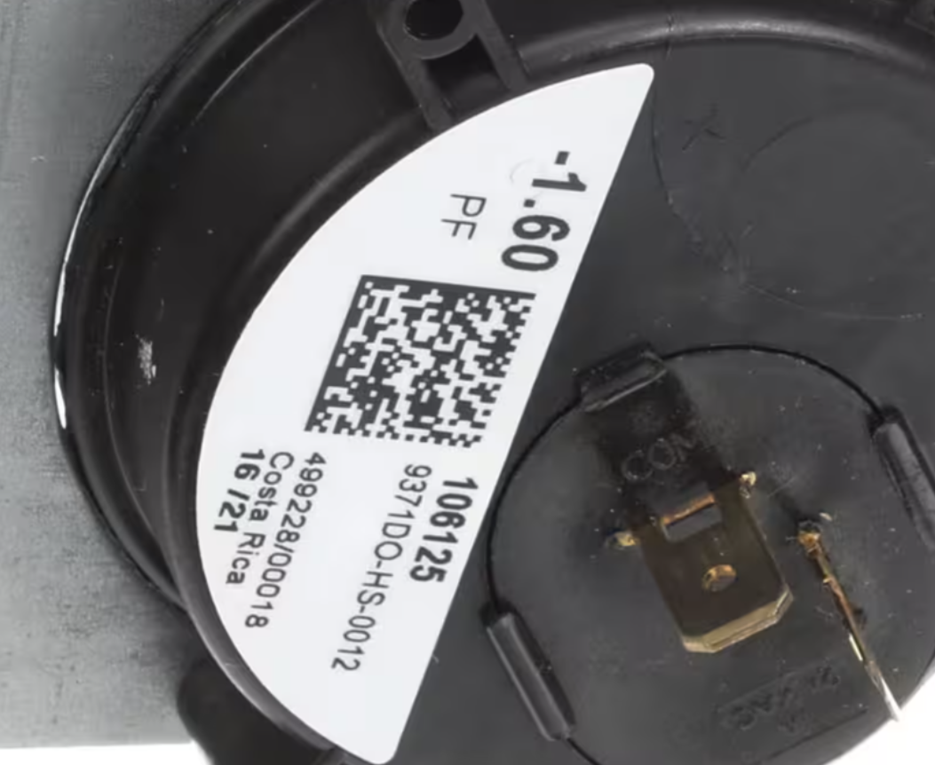 The York 106125, 9371DO-HS-0012, 499228/00018 Air Pressure Switch (1 Unit) is a genuine OEM single-pole normally open switch that ensures safe and efficient operation in York HVAC systems. Designed to monitor air pressure levels, this switch activates or deactivates circuits when airflow or pressure falls below 1.60" WC, providing reliable system safety control.