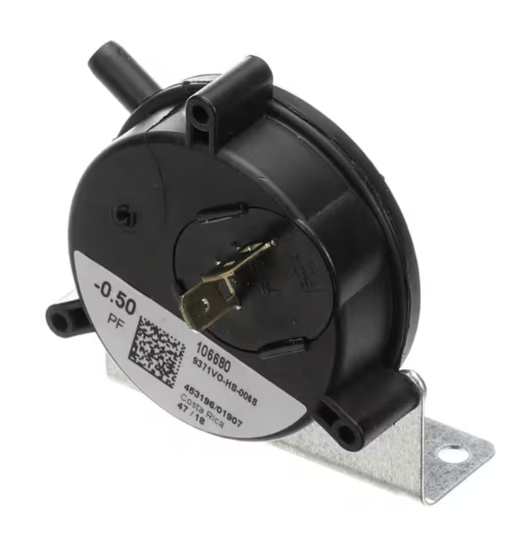 The York 106680 (9371VO-HS-0068, 453196/01907) Air Pressure Switch is a precision-engineered safety control component designed to monitor and respond to air pressure changes within York HVAC systems. Calibrated to activate at -0.50 inches of water column on pressure fall, this switch ensures safe and efficient system operation by preventing fan and furnace malfunction. It?s a reliable OEM replacement part, ideal for maintaining consistent performance and system protection.
